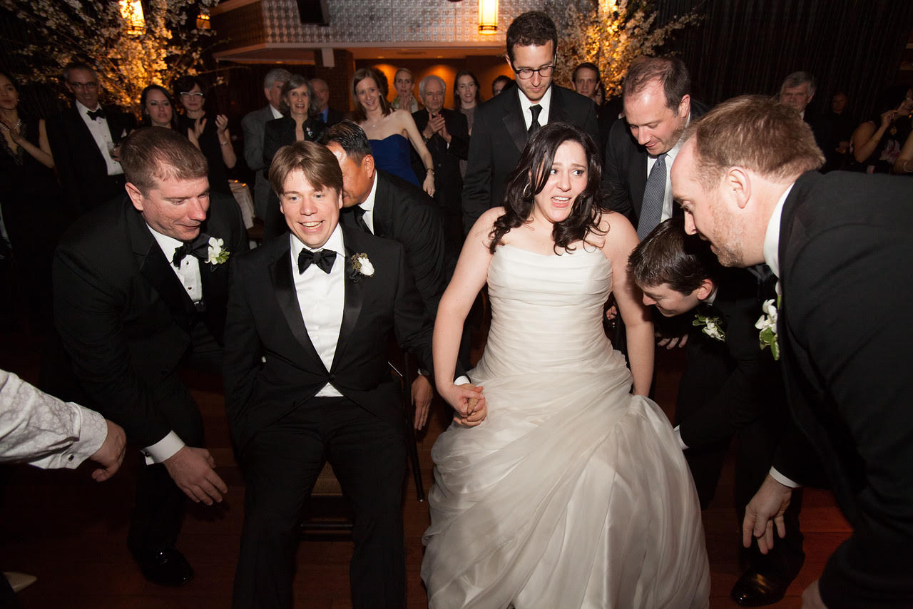 “I adored my wedding. There is very little I would change. Most of all, I loved dancing all night with my new husband. But I do wish I had relaxed about the whole up-in-the-chair thing. At many Jewish weddings, guests get two chairs and use them to hoist the bride and groom into the air, and bob them up and down. The anticipation (of nausea, broken bones, being too heavy) was way worse than the actuality. By the way, notice in the photo how Stan, the Episcopalian, could not have been more psyched!” — Nora (and Stan)