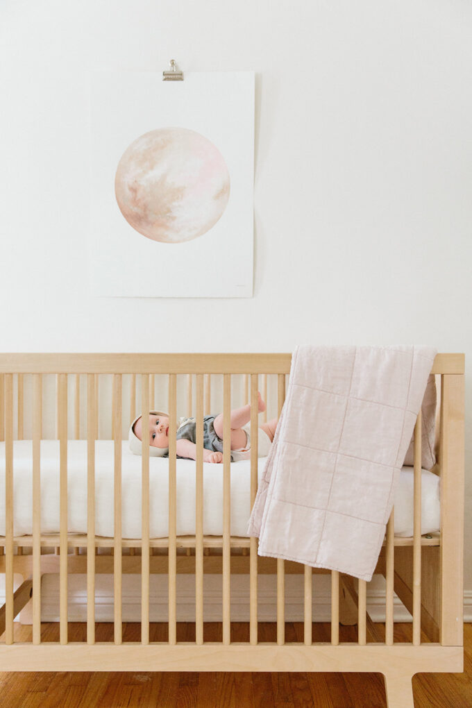 After using the linens for a few weeks, Lauren said the piece she loves the most is the blush baby quilt. “It adds a little pop of color to the room, without being too girly, and we have been using it for some cozy tummy time outside in the grass.” The quilt is made of garment dyed linen on the front and long-staple Egyptian cotton on the back. It’s medium weight, so you can use it year-round once your little one starts sleeping with a blanket.