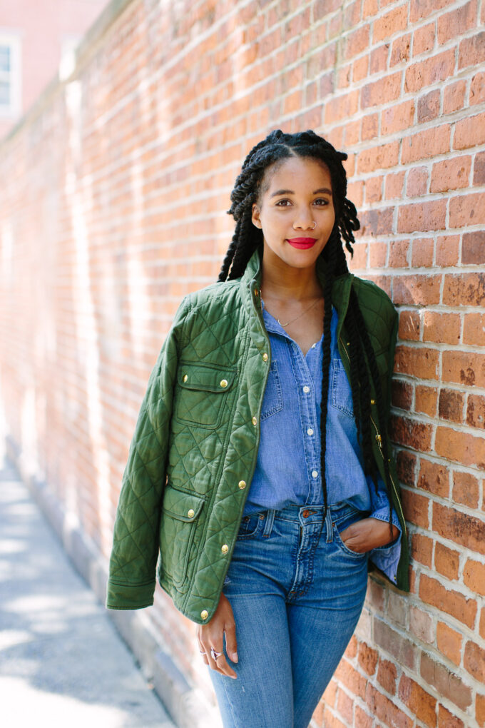 A fun way to experiment with a monochrome look? Wear all denim. A slouchy chambray shirt looks good tucked into vintage-style jeans. Add a green quilted jacket, leather loafers and a bright red lipstick, if you’d like some contrasting color.