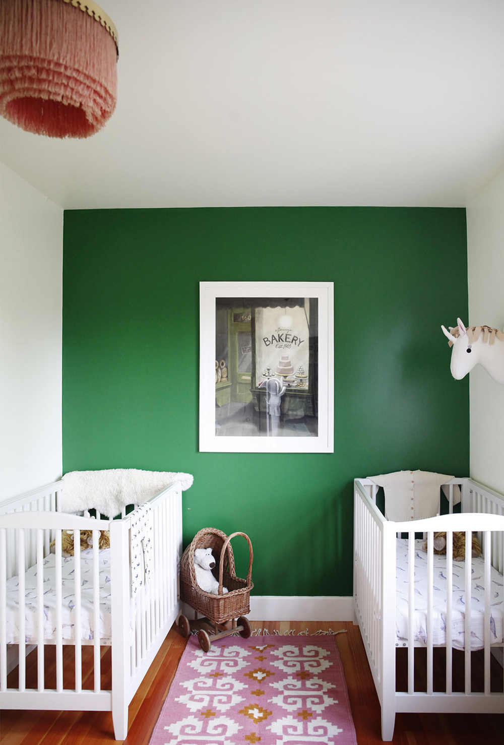 Cribs: Pottery Barn. Print: Mike Curato. Unicorn: Target. Chandelier: Hans-Agne Jakobsson found sjostromantik.se. Paint: Pantone.