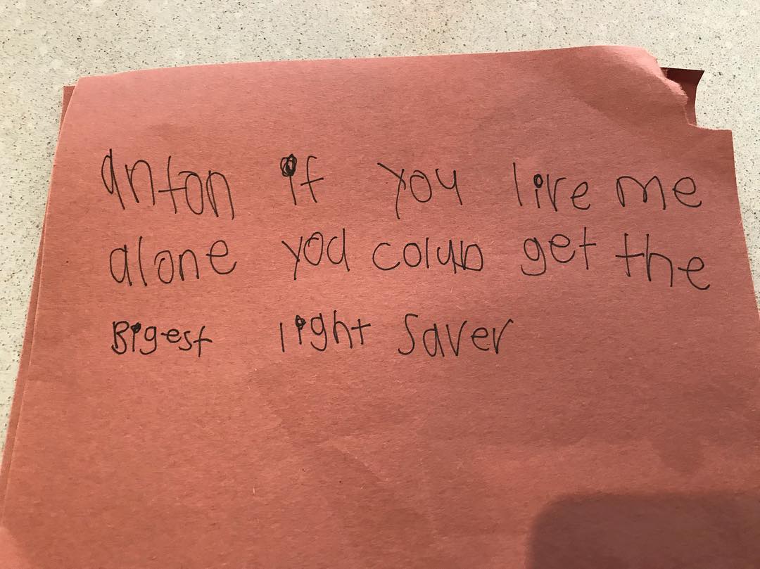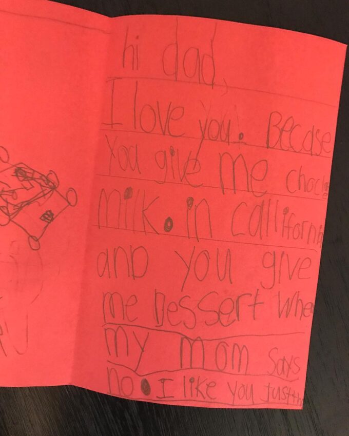 Toby has been writing more now that he’s older, and it has been sweet to hear his thoughts that way, too. For example, his birthday card for Alex: “Hi Dad, I love you. Because you give me chocolate milk in California and you give me dessert when my mom says no. I like you just the way you are. Love, Toby.”