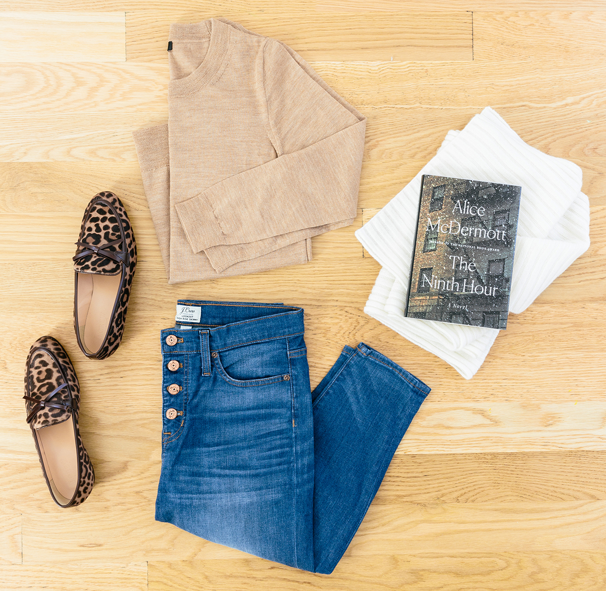 Camel cashmere sweater. High-rise jeans. Animal-print loafers. Cashmere scarf.