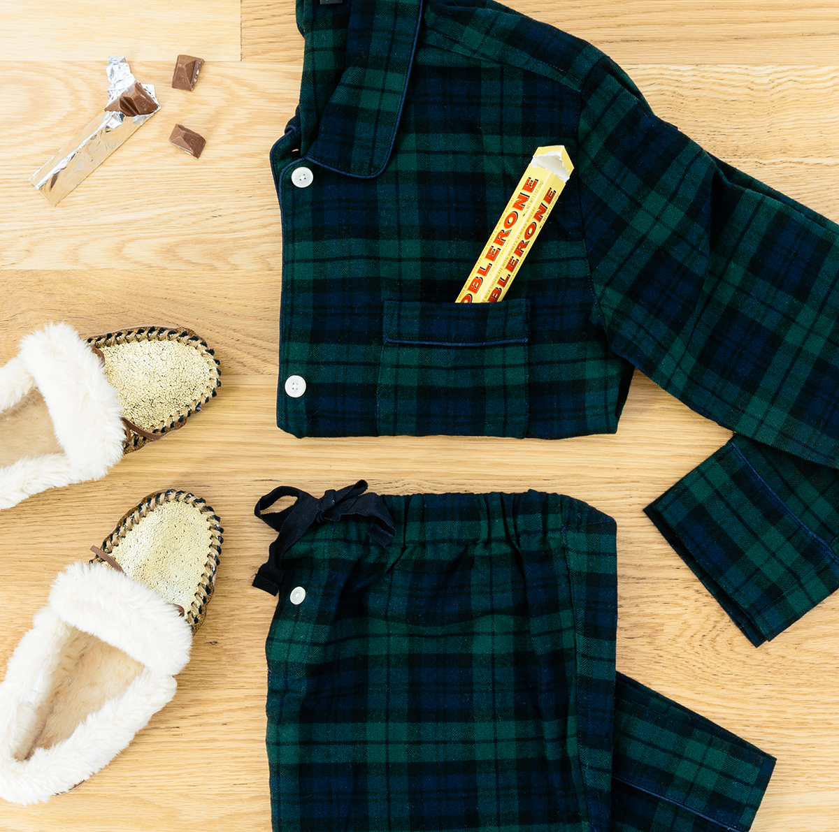 Flannel pajamas. Shearling slippers.
