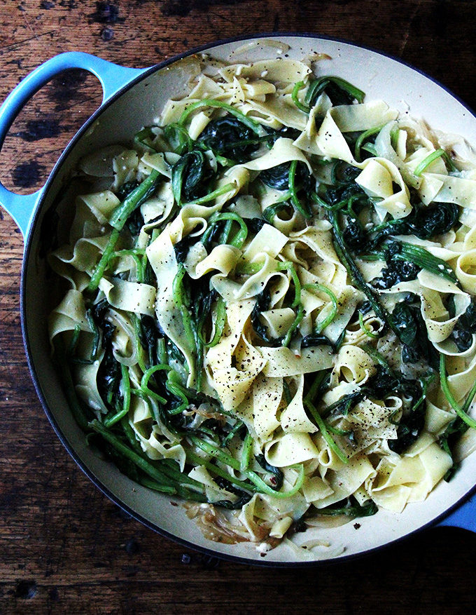This is one my family’s favorite weeknight dinners. The dish comes together in about 20 minutes. I love the addition of bacon found in classic carbonara recipes, but it’s not missed in this version. And though the heap of greens wilts down to seemingly nothing, I know it’s there, doing all the good things a heap of greens ought to be doing.