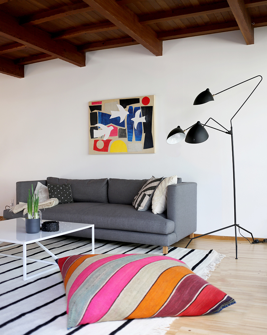 On a mixing things up: Pretty much everything I do — in my work as a toy designer for Petit Collage and in my home — has lots of color. We don’t stick to a certain aesthetic, but just choose things we like, including vintage pieces, IKEA finds, and stuff I’ve made. I actually painted the piece above the sofa and made the floor pillow from a vintage rug.
