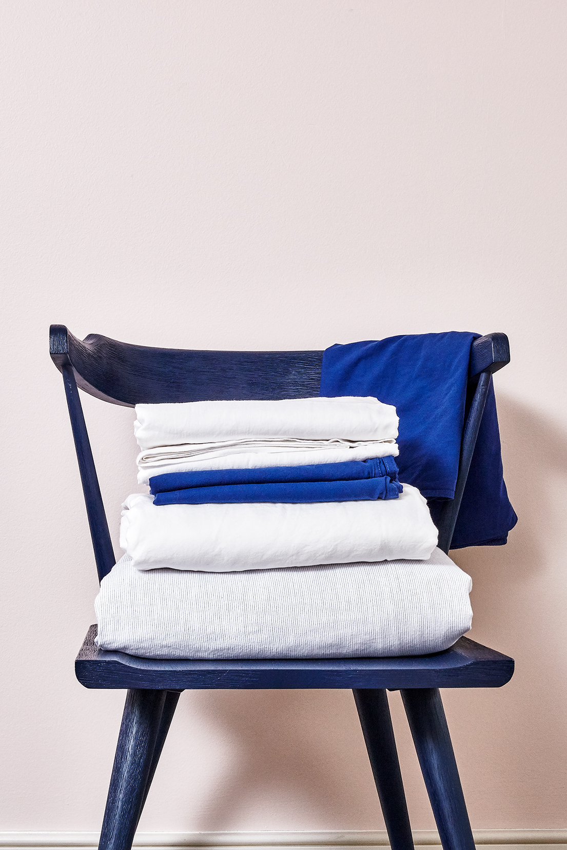 The twill collection is produced at an historic family mill in Portugal, where generations of expertise are applied to the process. The twill bedding comes in five colors — white, navy, navy stripe on white, cream, and charcoal stripe on cream. We chose navy sheets; pillowcases in both white and navy; and a white duvet cover that drapes beautifully.