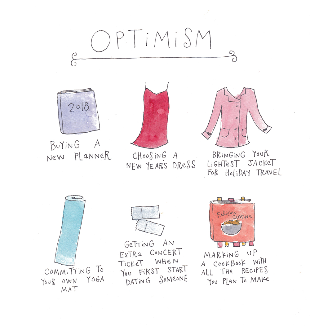 Haha, are we implying that “packing three times the clothes you need including a winter coat and sweaters of varying weights for a weekend trip” is pessimism? Also, I totally love reading cookbooks.