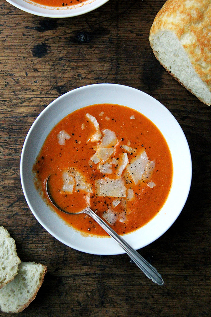 This recipe is incredibly simple, calling for nearly all pantry items: onions, garlic, tomato paste and canned peeled tomatoes. Heavy cream adds a necessary touch of richness and balances the acidity and sweetness of the tomatoes. Serve the soup with lots of freshly cracked pepper and shaved parmesan and bread, of course.