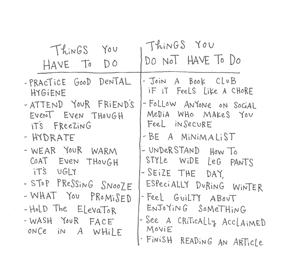 YES to including “be a minimalist” in the things you DON’T have to do! As a collector of many things, I will never, ever be a minimalist and, whilst I can appreciate it for what it is, I am fine with never being one – it just feels like everyone who IS one isn’t fine with it! Let me have my 25+ coffee mugs and money boxes that are shaped like other things if it makes me happy. They’re not hurting anybody!