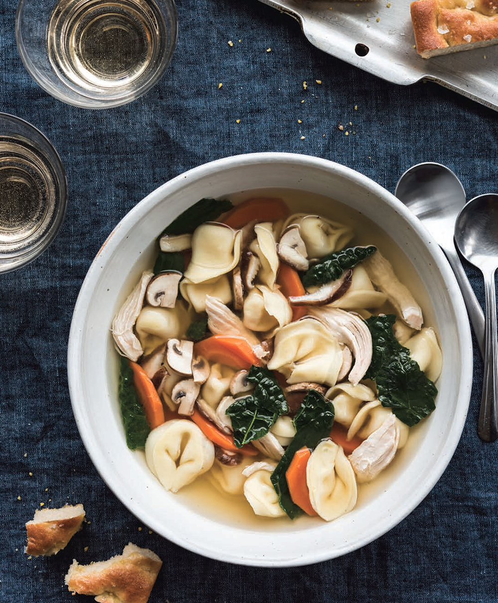 A specialty of the Emilia-Romagna region of Italy, this soup is the definition of simplicity — tortellini bobbing in a rich broth infused with a Parmigiano-Reggiano cheese rind. It’s elegant enough for a special occasion, but it’s easy enough to throw together on a hectic weeknight when you need a bowl of comfort. I doctor up the traditional pasta-broth equation a bit by adding shredded chicken breast and a handful of whatever vegetables are in season. In winter that means Lacinato kale ribbons and carrot coins, and in autumn I’ll use sliced wild mushrooms. Come spring, I’ll throw in fresh shelled peas or asparagus tips, and in summer, I’ll float a few halved heirloom cherry tomatoes and basil leaves in the broth.