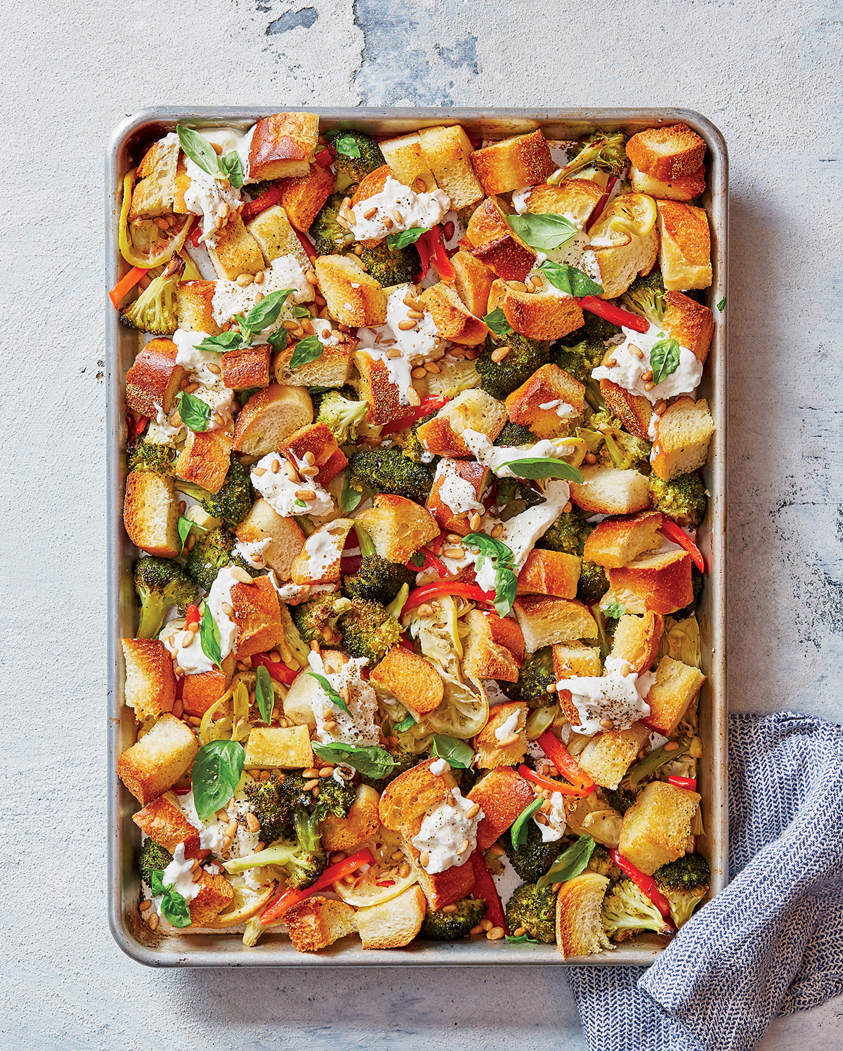 Scatter the bread cubes evenly over the vegetables. Return the baking sheet to the oven and roast until the bread cubes are golden brown and crispy on the outside and the vegetables are fork-tender, about 14 to 18 minutes more.