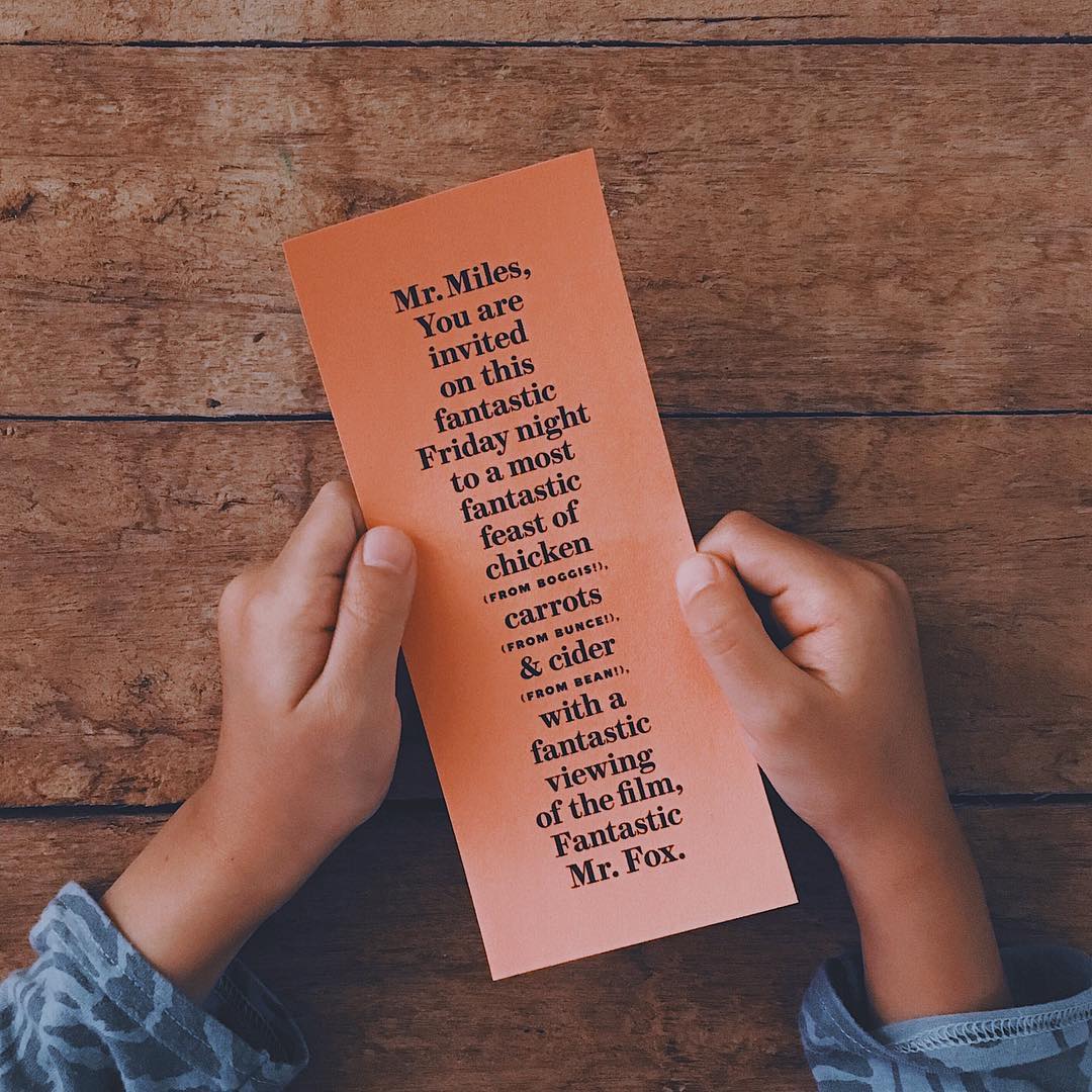 She printed out an invitation that read, “Chicken, carrots & cider from Boggis, Bunce & Bean” (actually: “from Seamless, the back of the fridge bin and the bodega downstairs that had one apple juice left!” says Erin).