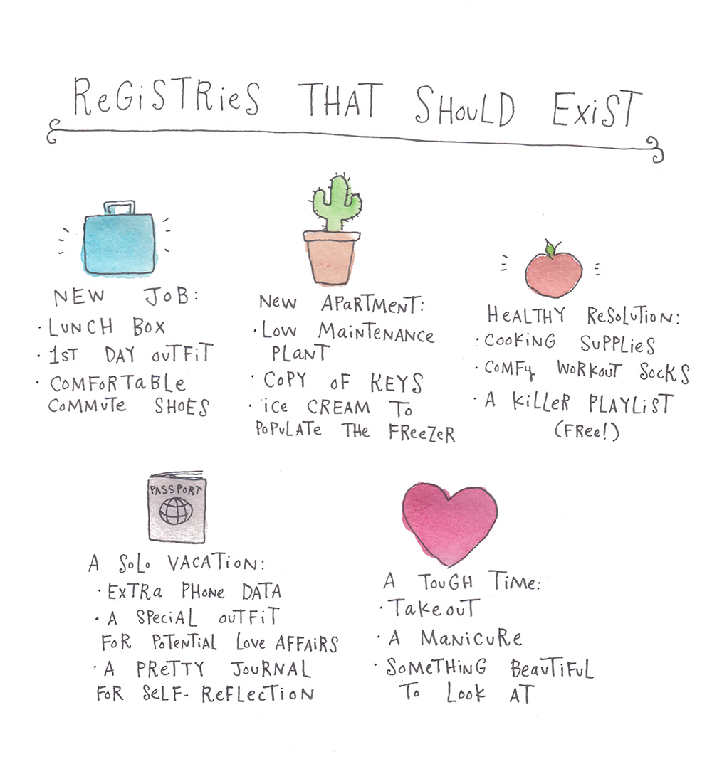 Let’s be the people who get our friends to make “registries” and then get them something off it. And tell other friends in the group so they can chip in too! This lovely illustration can totally be real — all that’s needed is that we decide we want it to happen.