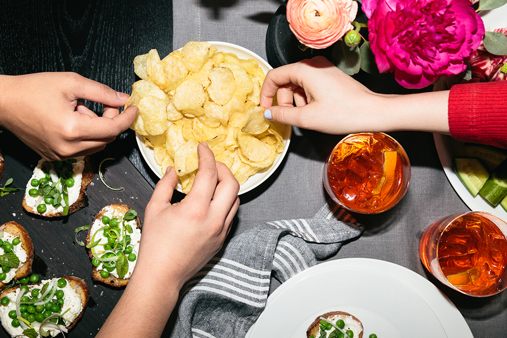 5. Snacks are the real heroes of night. There are few things more devastating than showing up hungry to a dinner party, only to realize a) food won’t be served for a couple more hours and b) the last little smokie has been nabbed. Keep appetizers as plentiful as possible. People love chips! People love dips! (This one has only two-ingredients.) Plus, everything looks impressive on a pretty platter or cheese board.