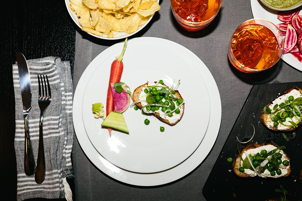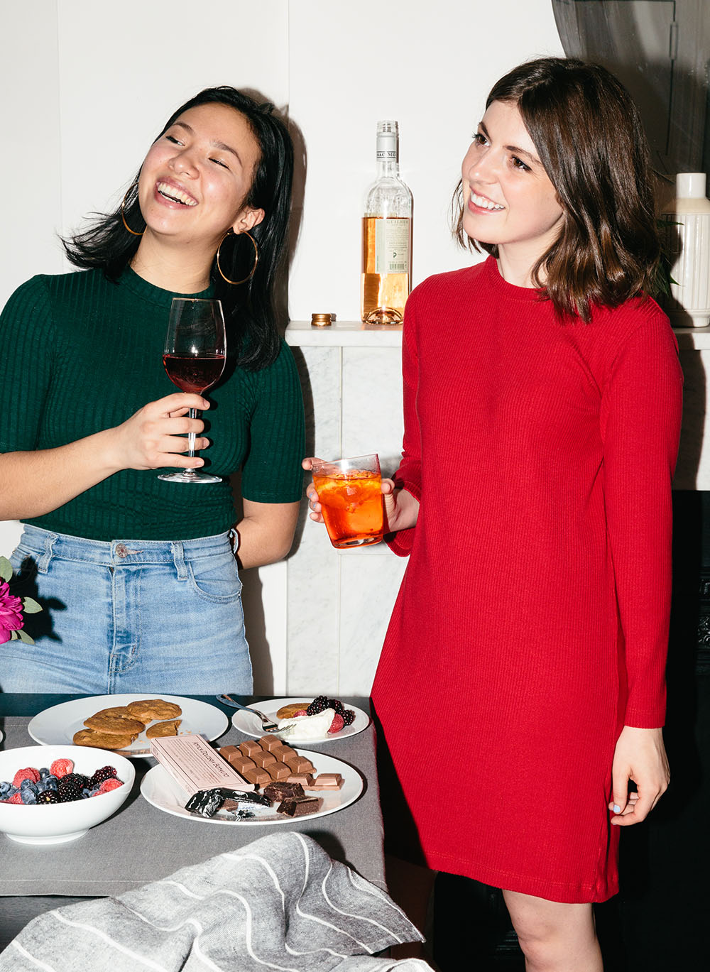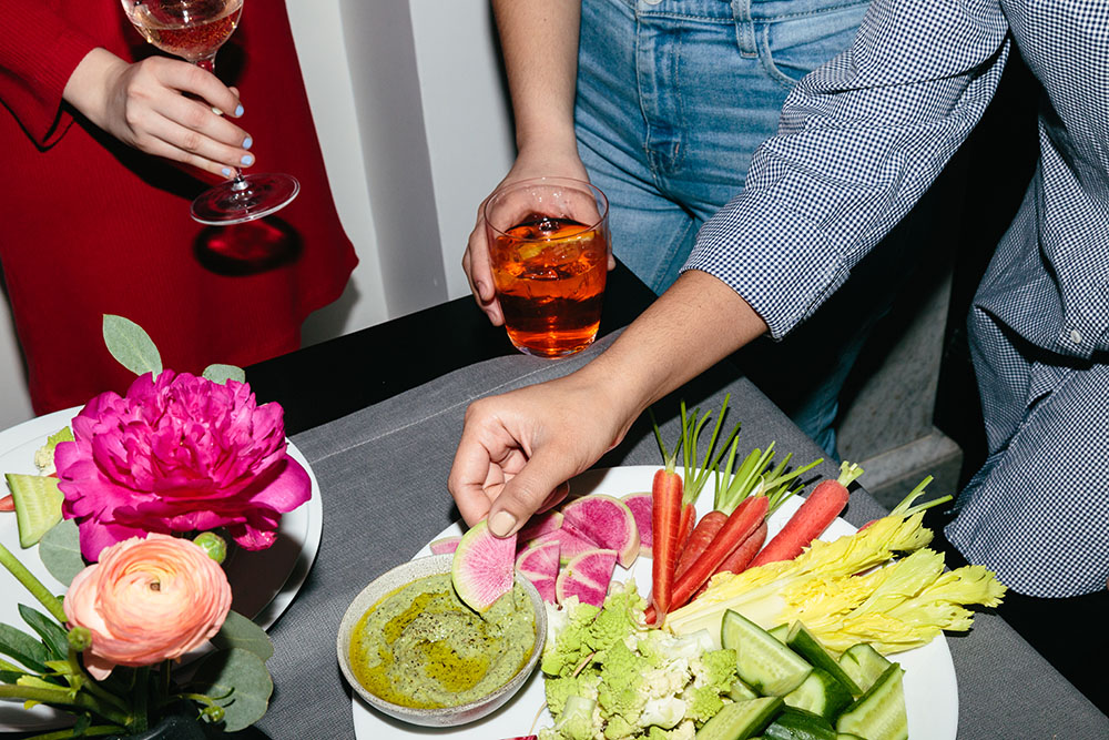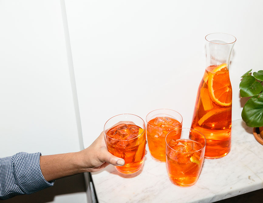 4. Drinks are outsourced. Ask guests to bring a bottle of wine, citrus seltzer or whatever else they want to sip. That way, as my friend says, “Everyone is in charge of their own happiness.” Plus, party costs are cut in half. Set out a drink station with wine glasses, tumblers and an ice bucket for guests to serve themselves. If you’re in the mood to be a little *extra*, a house cocktail is always a hit, too. The trick for keeping it easy (and not playing bartender all night) is pre-made pitchers. Before guests arrive, I fix up a carafe of Aperol (a low-key Italian apéritif), sparkling water and orange wedges.
