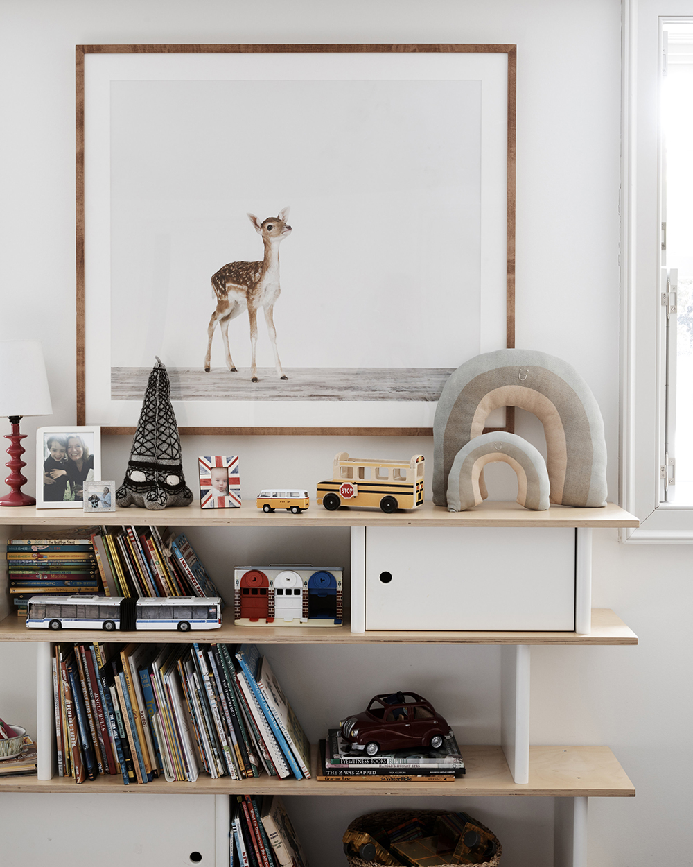 (Photo of Toby’s bedroom by Alpha Smoot. Bookcase by Oeuf. Deer photo by Sharon Montrose.)