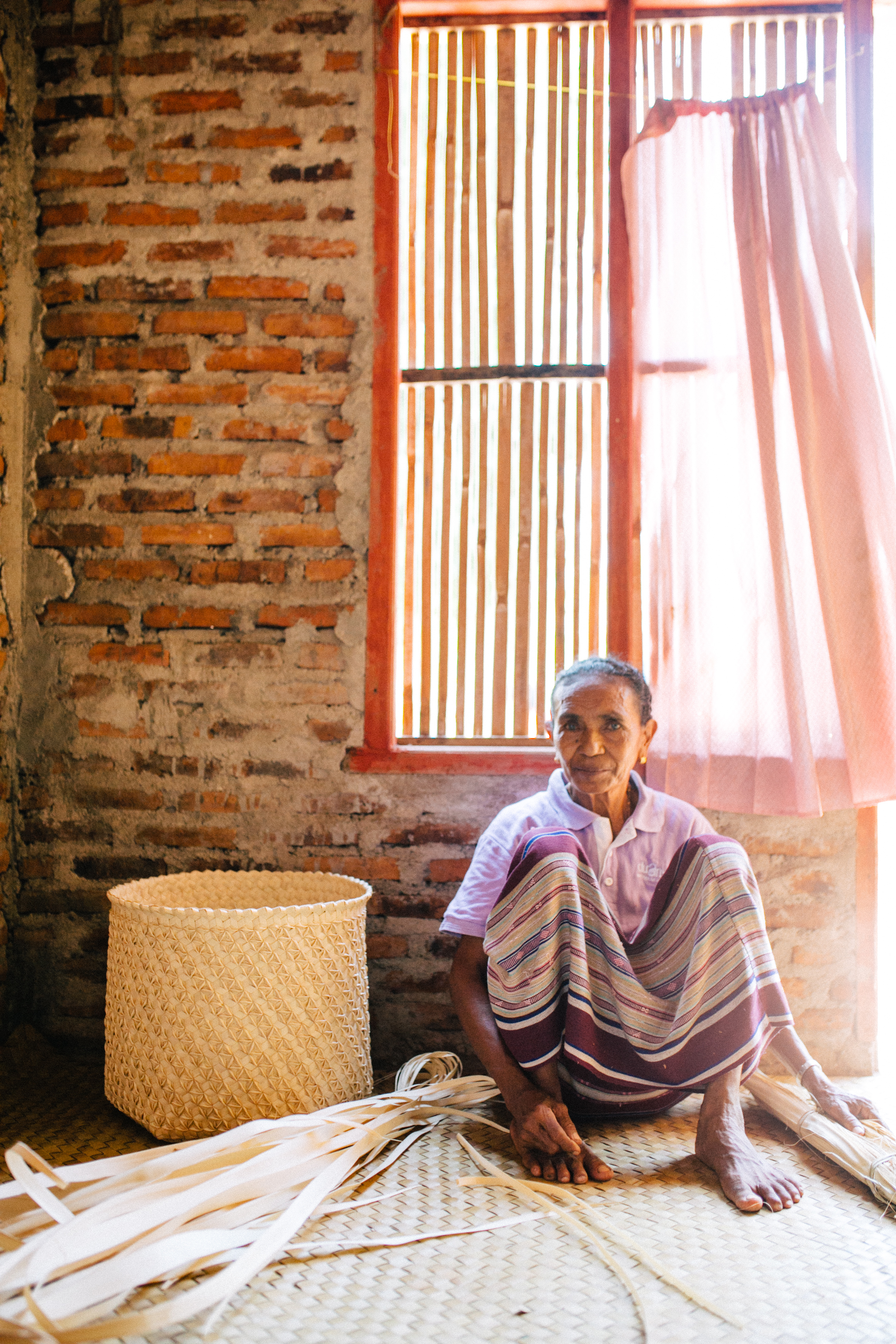 A weaver in Solor Island, Indonesia, with one of the Citizenry’s Solor Palm Baskets.