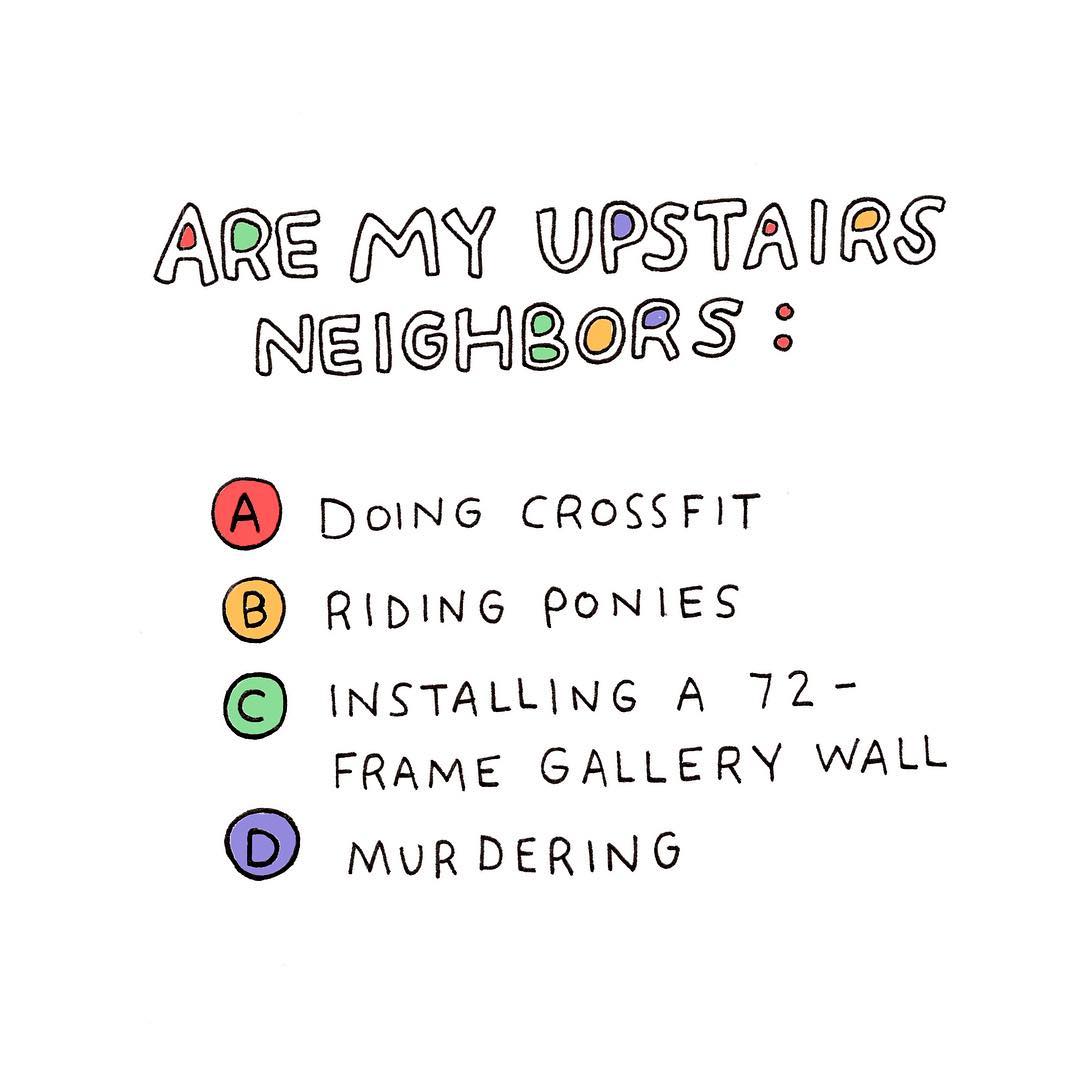 Do you have any neighbor horror stories? (Our old upstairs neighbors always sounded like they were moving furniture in the middle of the night.) Olivia de Recat‘s illustrations made us laugh.