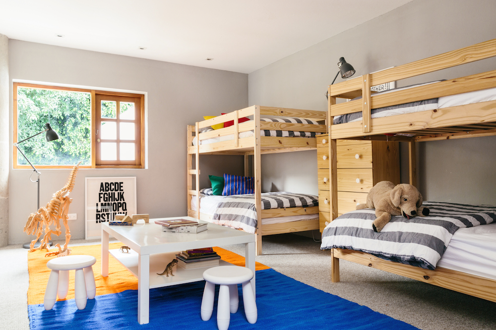 Bunk beds: Ikea. Table: Ikea. Stools: Ikea. Rug: custom made by Tapetes Gualupita (Made in one week!).