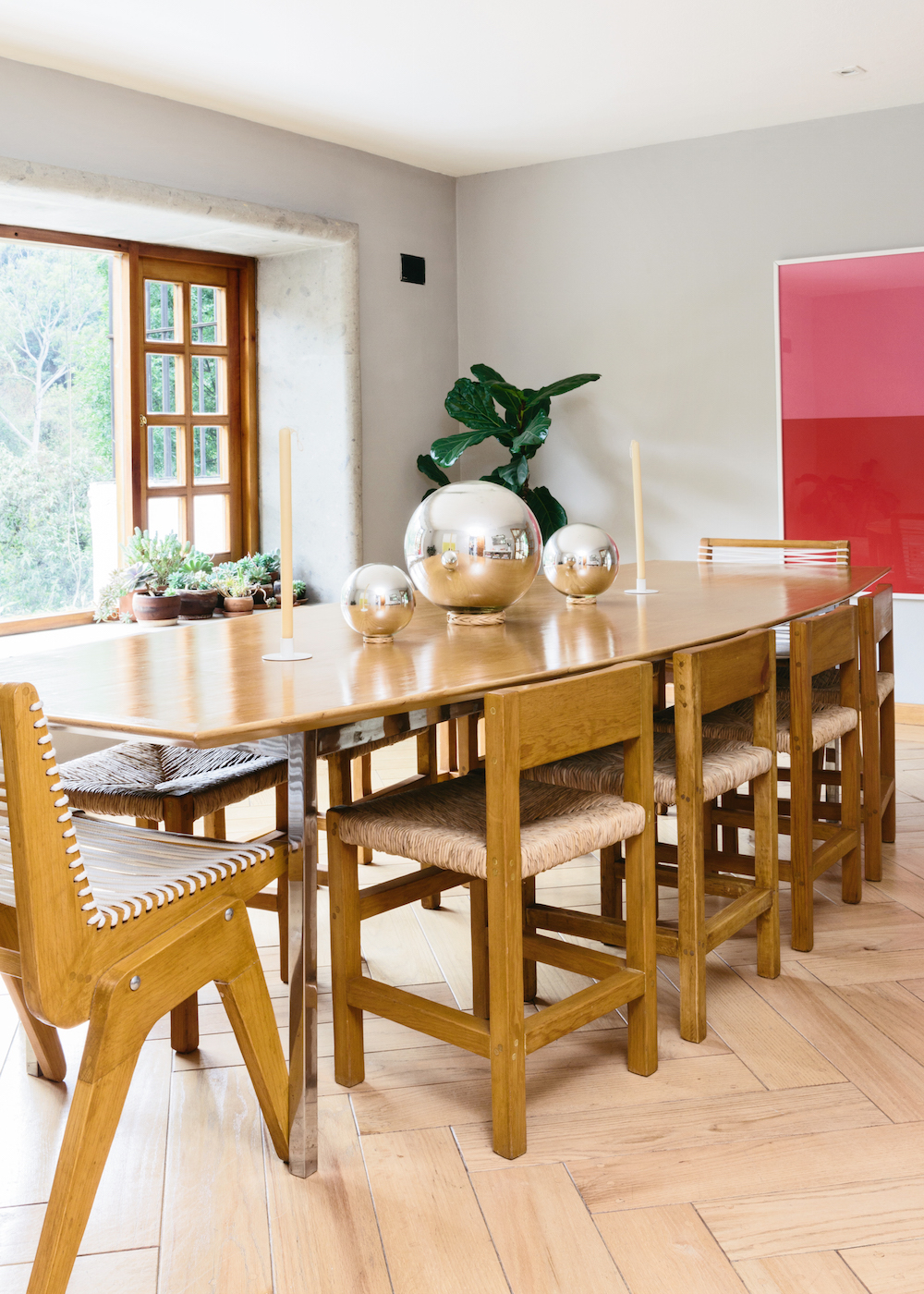 On local inspiration: Long before moving here, I was fascinated by Mexican architect Luis Barragán. In Mexico City, you can visit Casa Barragán, Cuadra San Cristobal and Casa Gilardi, which was built around a single Jacaranda tree. He painted the walls in the courtyard in shades of lilac and pink, so when the tree is in bloom, the house is spectacular. In his homes, he often used local materials that weren’t fancy, but the way he placed them would elevate the designs. He used blown glass spheres as decorative objects, so I found these at the market and put them on the table.