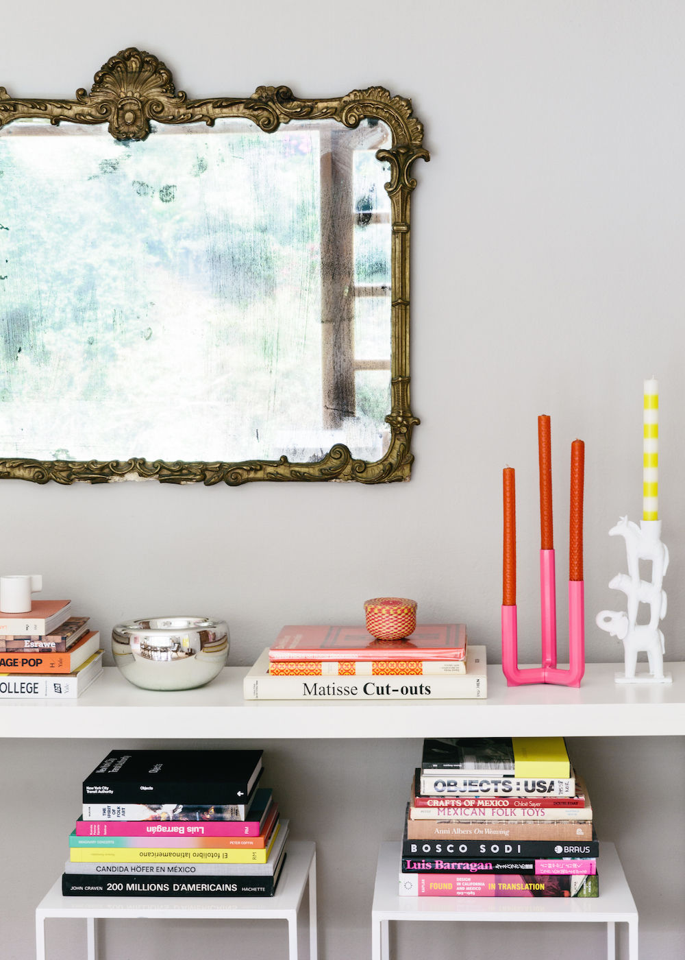 Mirror: NYC flea market. White console table: Ikea (similar). White accent tables: custom made by Herreria y Aluminio en General. Pink candelabra: Ikea. Elephant candle holder: Onora.