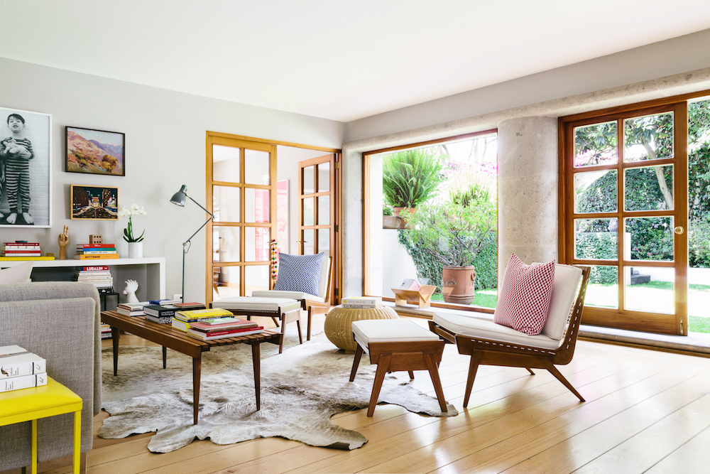 Sofa: Ikea. Wooden chairs with ottomans: vintage Clara Porset, found in Mexico. Side table: Franco Albini. Cowhide rug: purchased from a truck in Lomas, Mexico. Magazine holder: Book/Shop.