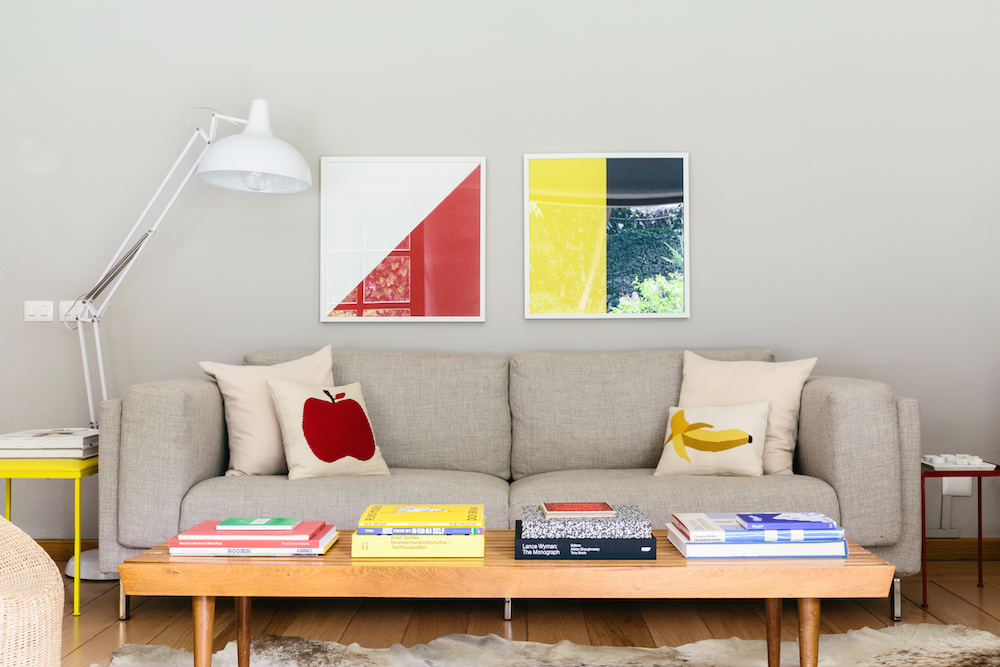 Sofa: Ikea. White lamp: Crate & Barrel Kids. Yellow end table: eBay. Coffee table: purchased 18 years ago in Red Hook, Brooklyn.