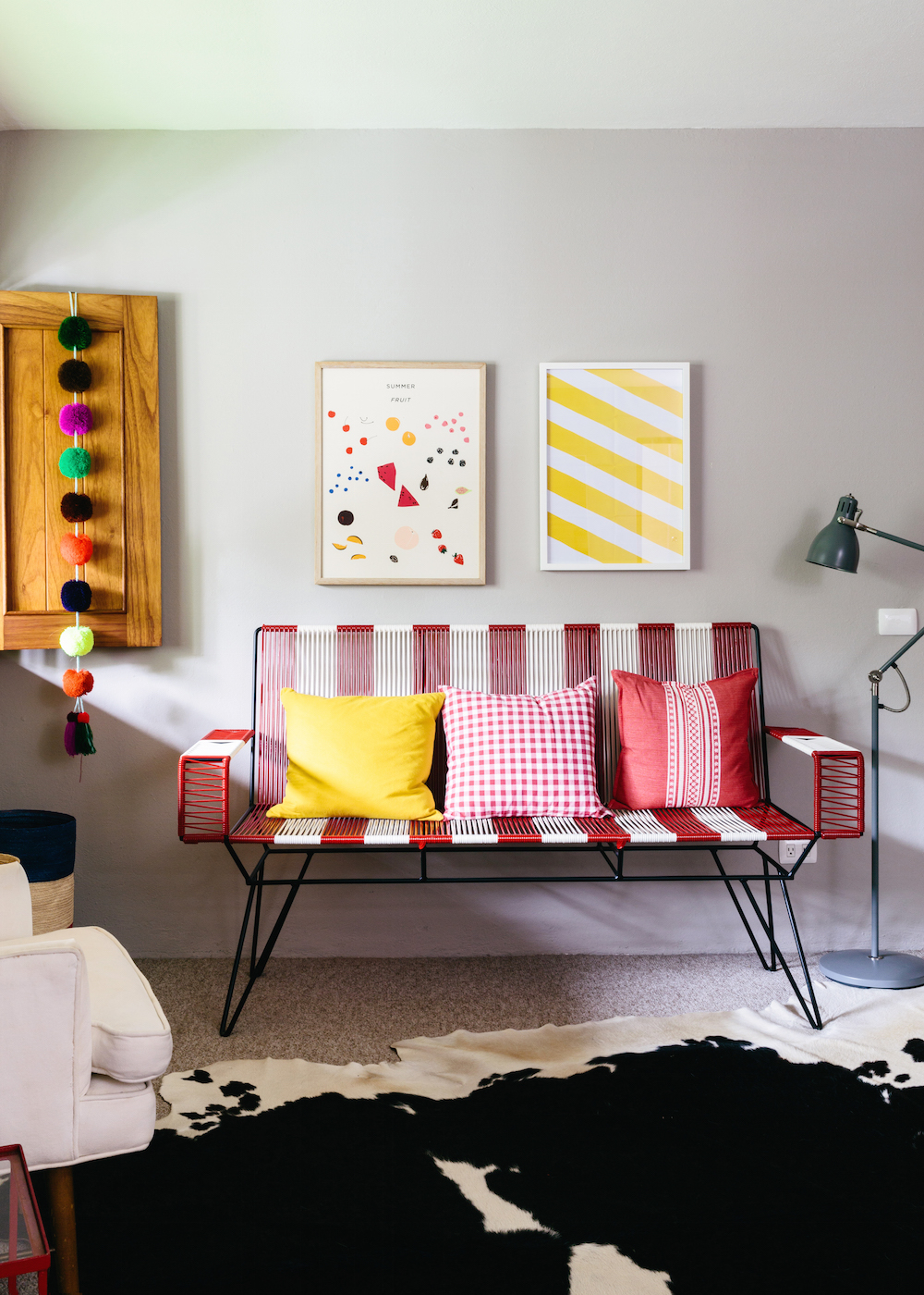Striped bench: custom made by Akele. Yellow pillow: H&M Home. Checked pillow: Ikea. Striped pillow: La Ciudadela Mercado de Artesanías. Summer fruit print: Otherwild.