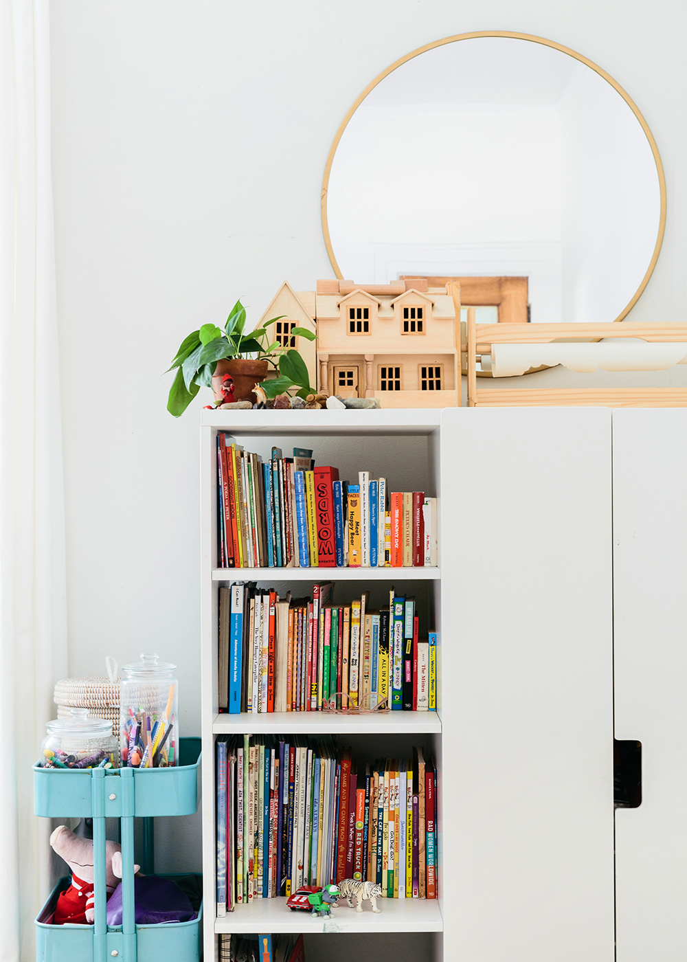 Blue storage bins: Ikea. Circle mirror: Ikea, similar.