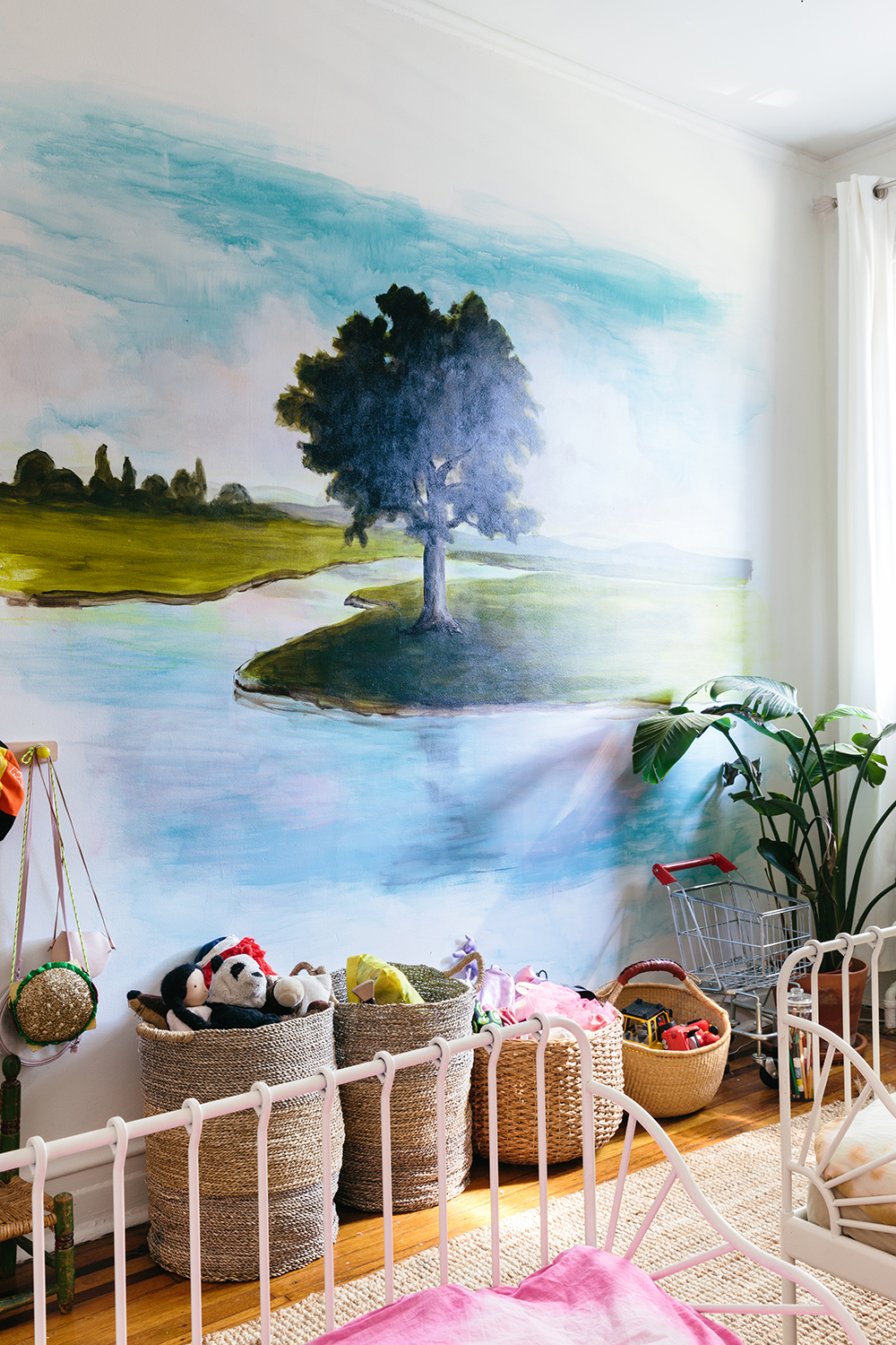 On the bedroom theme: I like to think of them falling asleep in a peaceful forest every night. The lamp shines stars on the ceiling when it’s dark, and the blankets are naturally dyed with turmeric and flowers. Oak has a zebra over his bed, and River has a unicorn. My friend Jenna painted the mural in honor of the kids — you’ll notice it’s a river surrounding an oak tree.