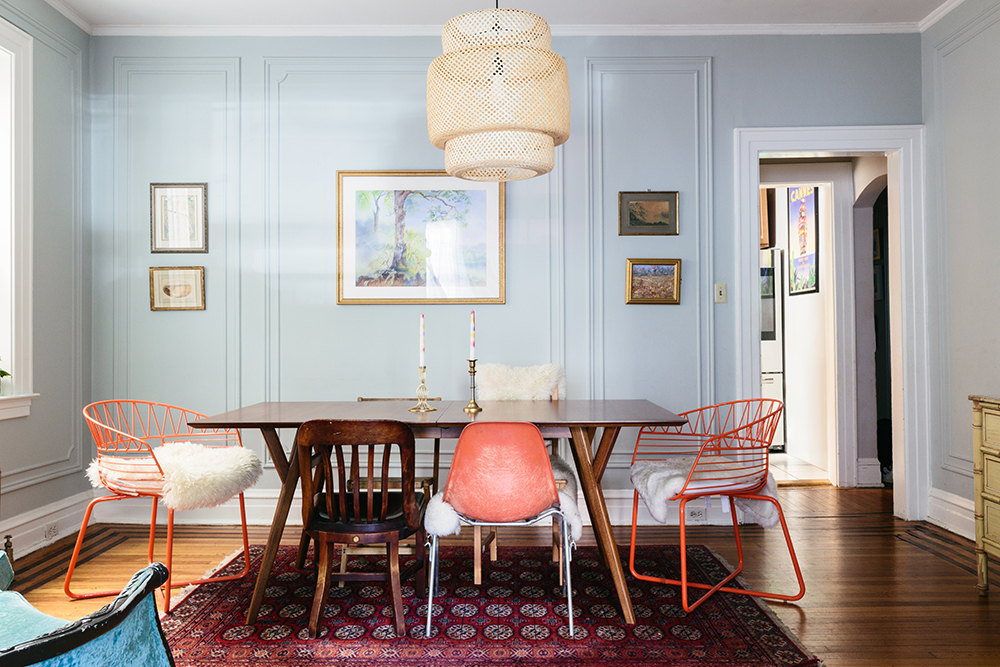 Pendant lamp: Ikea. Table: West Elm. Orange chairs: West Elm. Rug: vintage.