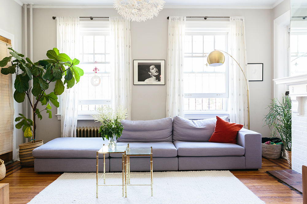 Pendant lamp: Ikea. Sofa: Article. Floor lamp: World Market. Gold tables: vintage.