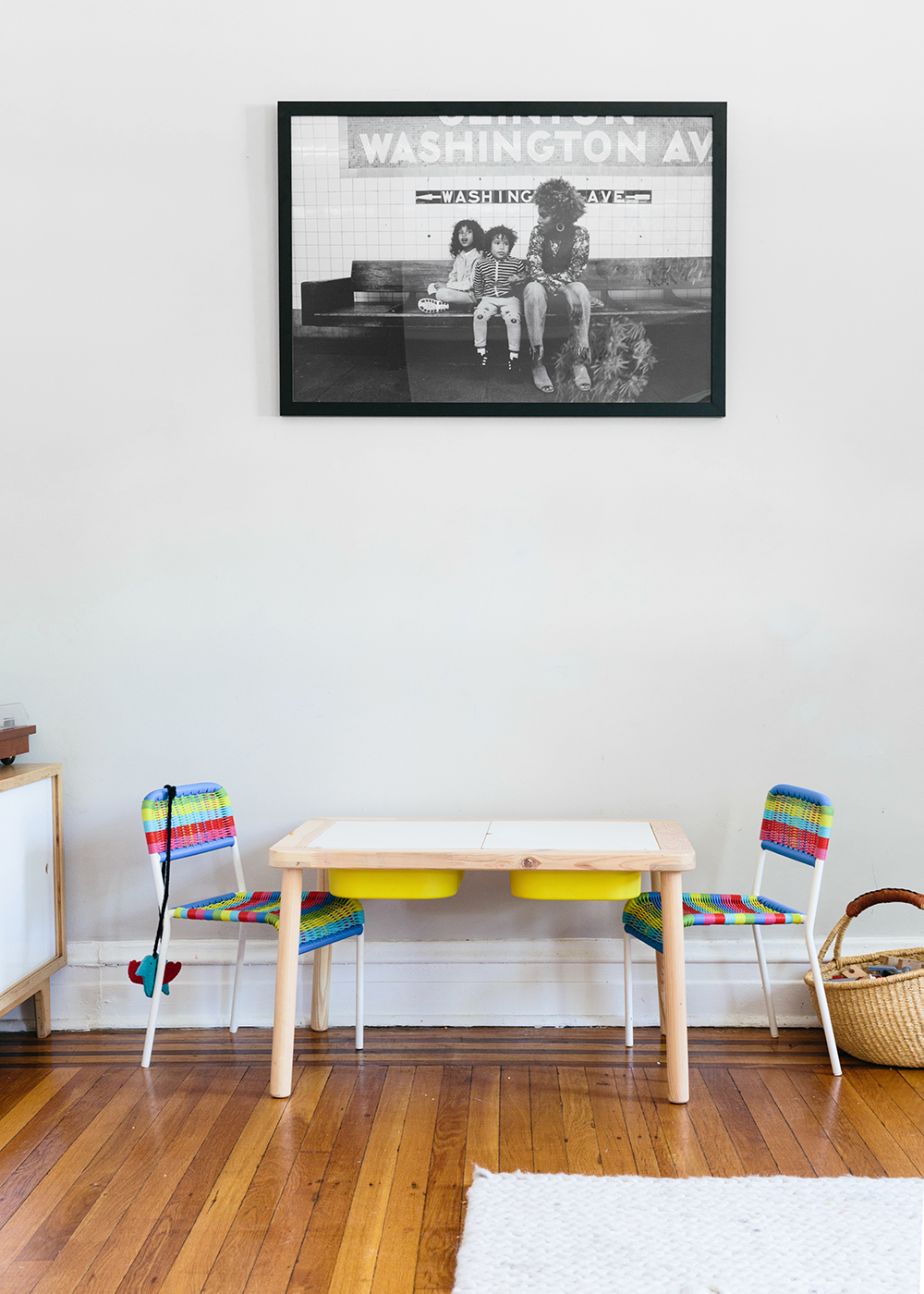 On a family photo as artwork: I got this photo of us blown up with Framebridge. I like that it looks like a piece of art of New York City. This is 100% our real life. We are on the subway twice a day. You’d think the kids would be bored by now, but they still love it. They’re like wild animals crawling on me while waiting for the train.