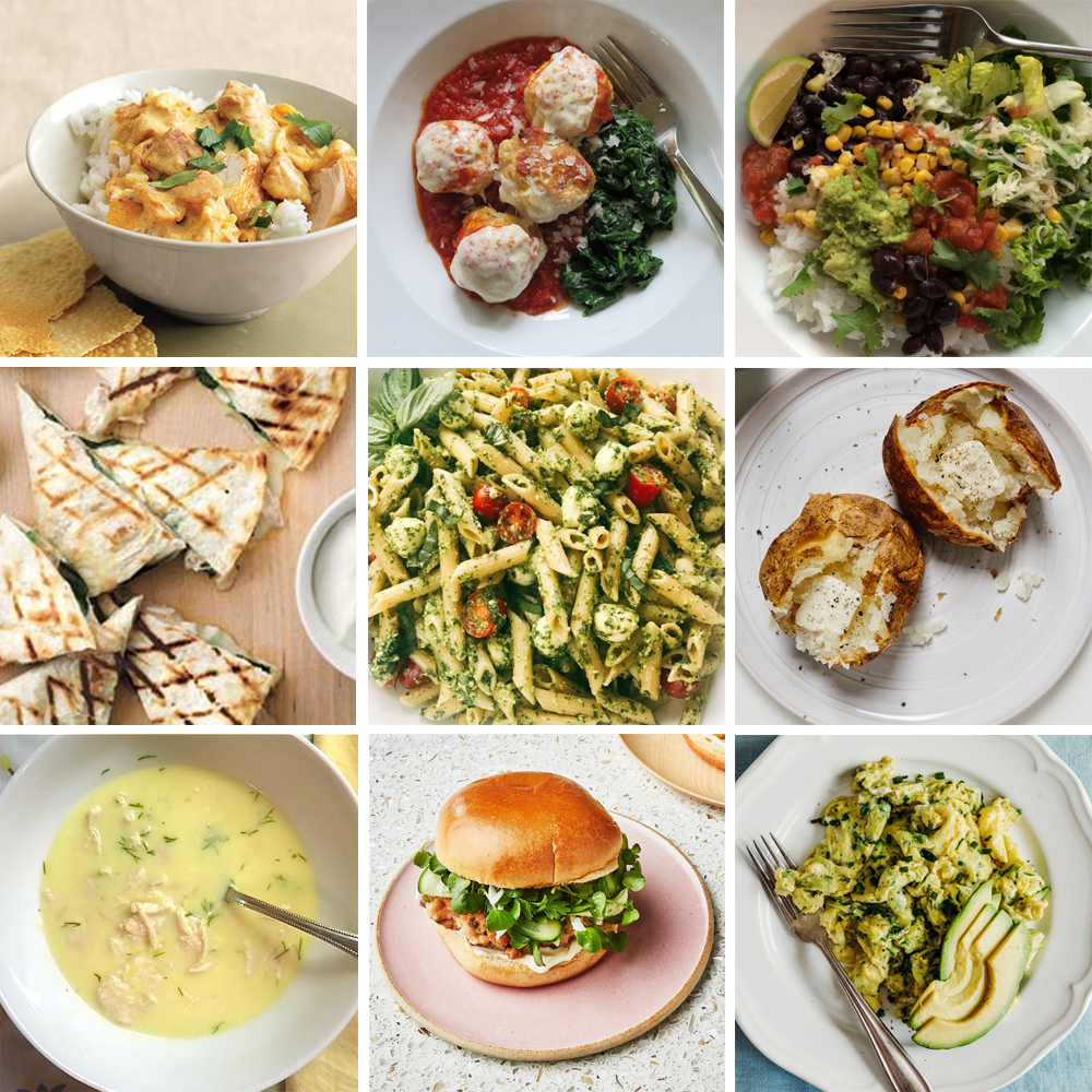 (Curry by John Kernick for Real Simple. Meatballs, burrito bowls and avgolemono by Jenny Rosenstrach. Quesadilla by Alex Farnum for Real Simple. Pasta by Three Olives Branch. Jacket potatoes by Yossy Arefi for Cup of Jo. Salmon burgers by Alex Lau for Bon Appetit. Eggs by Todd Wagner for The New York Times.)