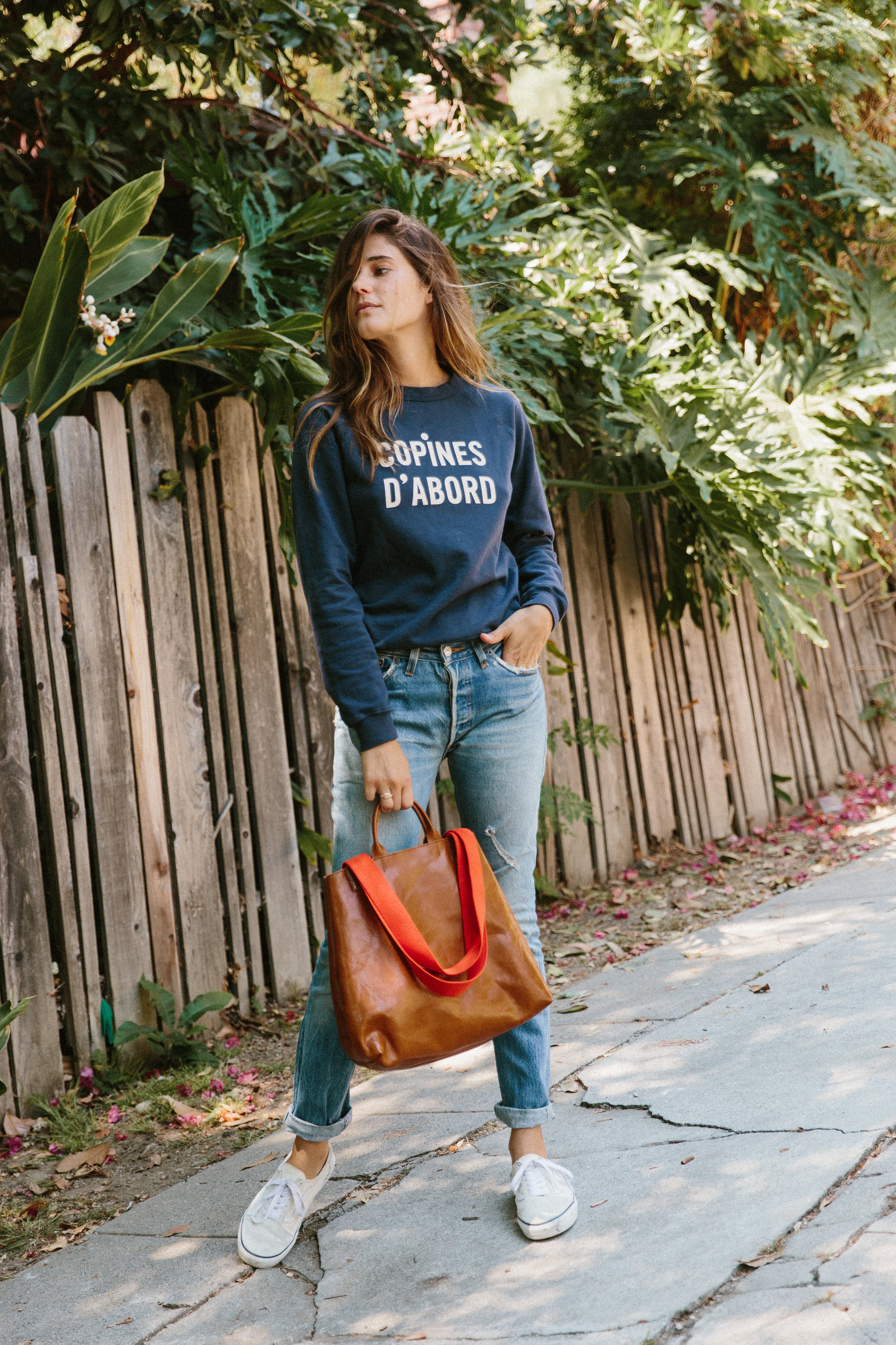 This super soft sweatshirt says “girlfriends first” in French! It looks so cute for weekend adventures, and it’s 100% organic cotton, with an easy, pre-shrunk fit for layering. It would make a great gift for friends, colleagues, sisters, aunts, moms and any other comrades that make life feel sweet. Update: The sweatshirt sold out, but a new run is now available for pre-sale. We also were able to add more sizes, XL and XXL, and in future collaborations will be adding many more. Thank you so much.