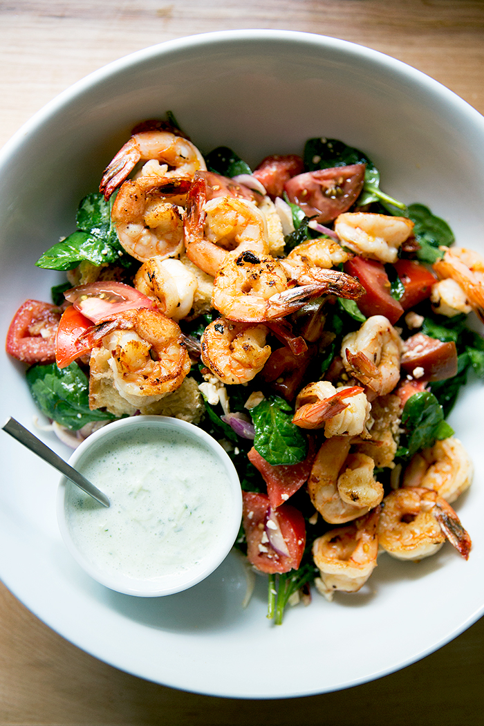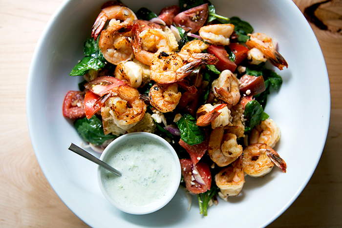 Pan fry shrimp with olive oil, salt, pepper, lemon juice and red pepper flakes. While that’s grilling, tear up some bread crusts, chop a tomato and red onion, and crumble feta into a bowl. Once the shrimp is done cooking, dump them and the pan juices over it all and top with red wine vinegar. Add some spinach and mix. To make the tzatziki, shred a bit of cucumber and mince some garlic into Greek yogurt; add some olive oil and whatever spices you love (salt, pepper, oregano or dill) and let it sit before dressing the salad.