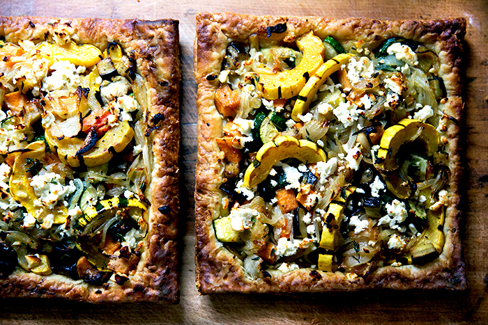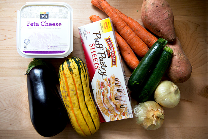 Take the pastry out of the oven and top with the roasted vegetables, caramelized onion and crumbled feta. The sides will puff up around the topped area, creating a border. Put it back in the oven for another 10-15 minutes until the pastry is flaky and golden. Enjoy!