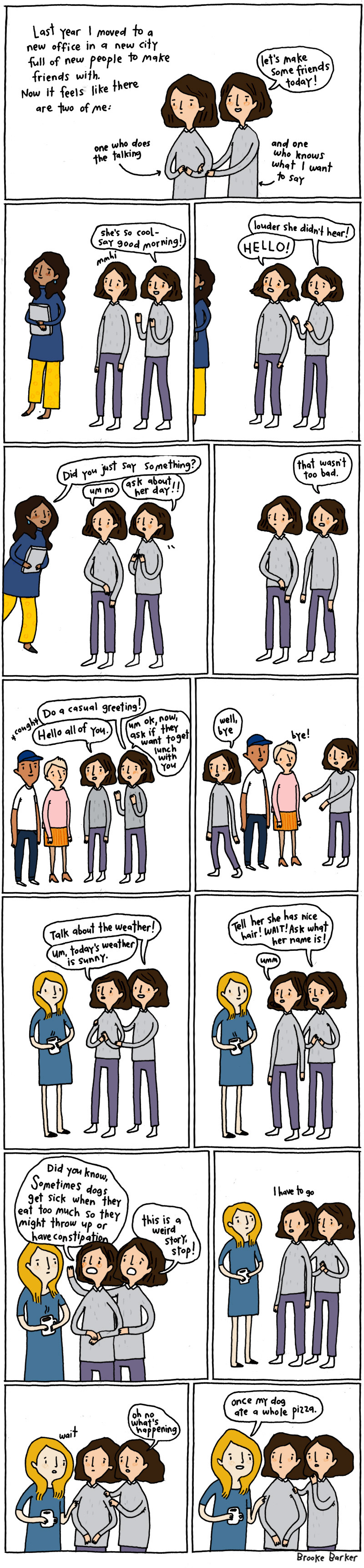 Just the LOLs I needed today! My partner and I moved to a new city a few months ago and have been missing hanging out with a good circle of girlfriends. To remedy this situation I downloaded Bumble BFF and now have two fun friend dates lined up for the weekend. It feels almost like dating! I am excited to hang out with my new friends but also a little nervous. This comic is so, so relatable and gave me just the little push I need to have fun and listen to the voice inside my head that says “Go out and enjoy these new connections – you can do it!” Lots of love and many thanks to Brooke Barker and the COJ team. <3