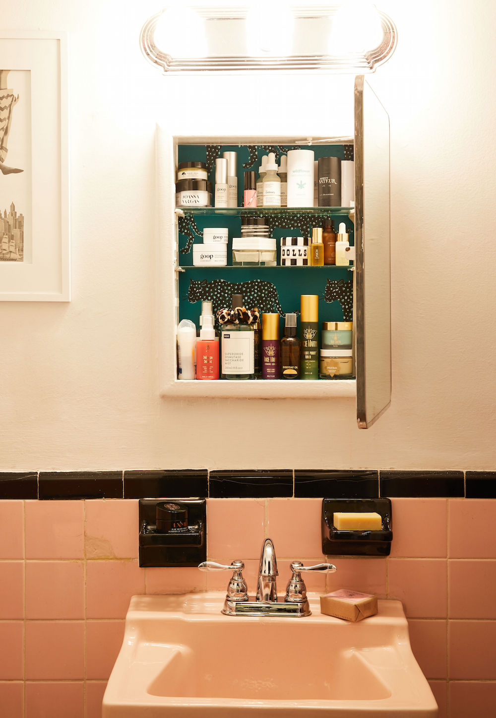 On bathing in 1950: The bathroom is of another time, but I love it. The tiles are the color of Pepto, and the water temperature in the shower has an agenda of its own. I lined the medicine cabinet with removable panther wallpaper, which serves the dual purpose of hiding unsightly rust stains and bringing me joy whenever I’m washing my face.