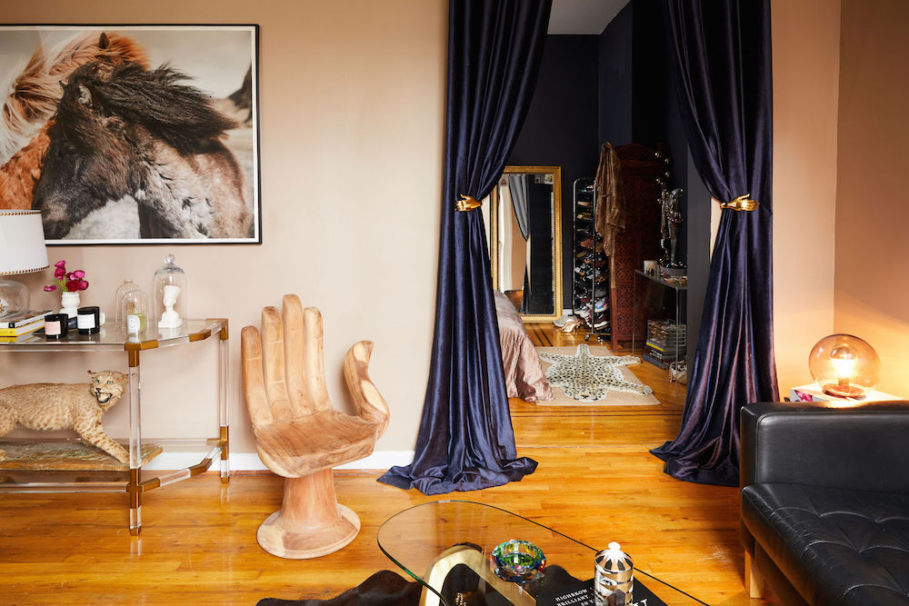 Hand curtain holders: Anthropologie. Leopard rug: Collyer’s Mansion.
