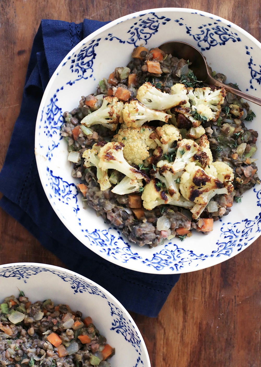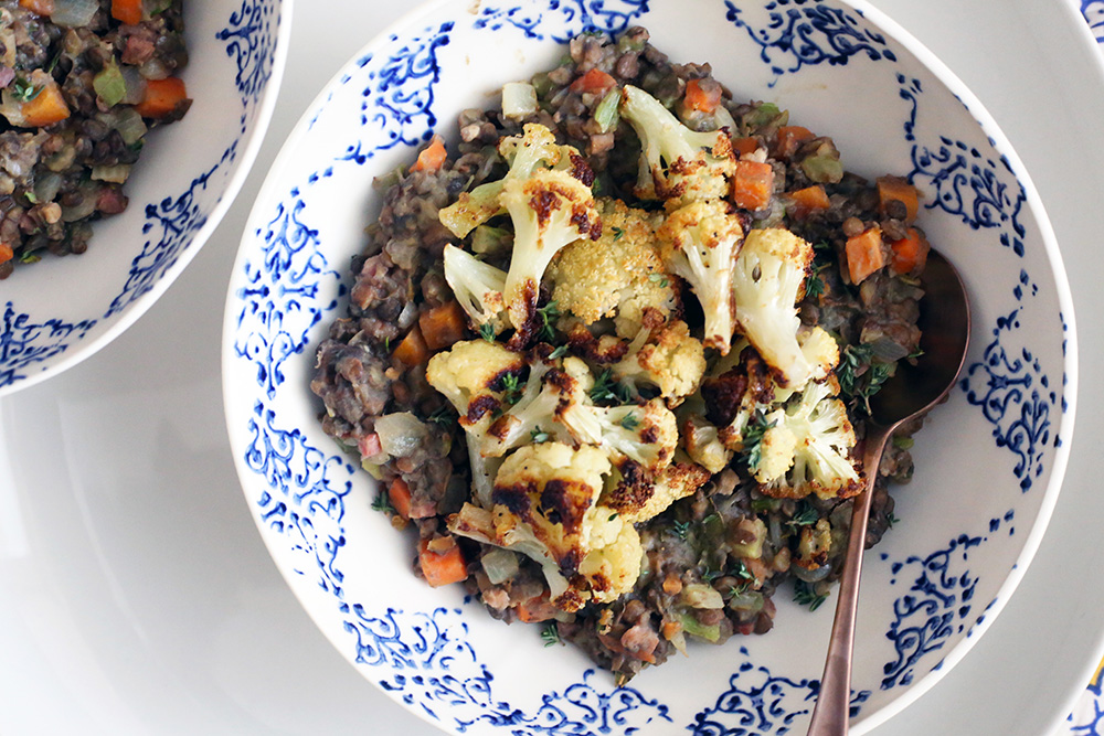 Over medium heat, sauté pancetta cubes in 1 tbsp oil. Add in TJ mirepoix and cook for about 3 minutes, until vegetables begin to soften. Add TJ lentils, and top with chicken stock, salt, pepper, fresh thyme and a bay leaf. Let simmer for about 15 minutes. After removing lentil mix from the heat, add sherry vinegar (“this is key for flavor,” says Karen). Top with roasted cauliflower and serve.