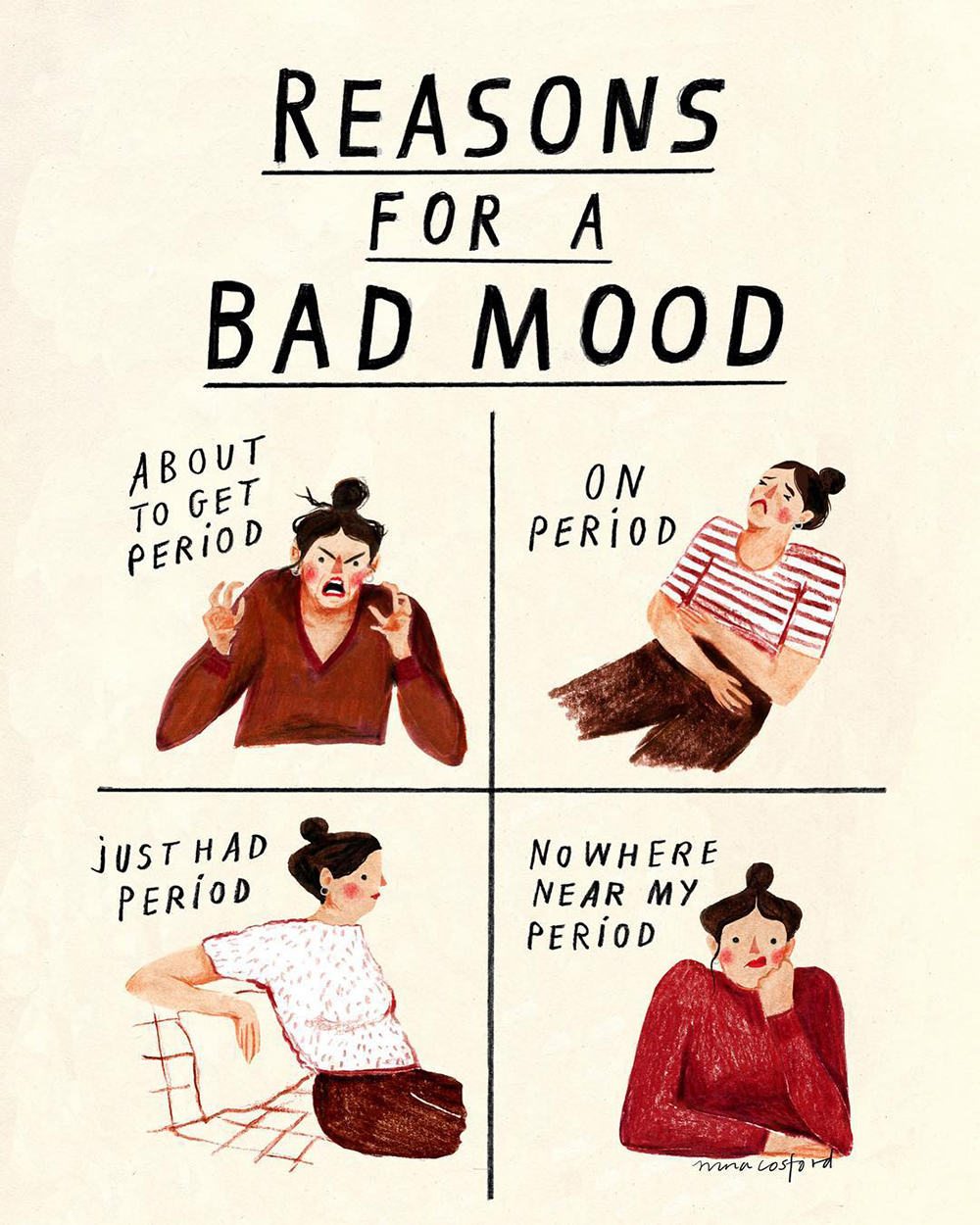 I completely relate with that. I feel better or slightly assured when that time of the month rolls around after a weird/hard/emotional day. I think, “Ah…it all makes sense now.” I don’t think Nina is trying to spread or encourage a stereotype that women are always in a bad mood. I can see how one may interpret it that way, but we should also keep in mind that the creator has his/her own perspective/inspiration/idea behind a drawing and ultimately, that’s what matters most.