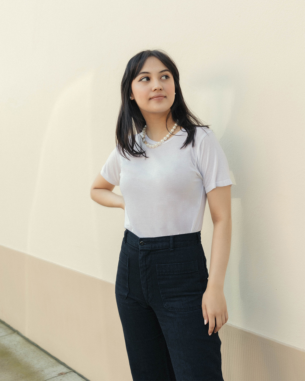 If you’re looking to ease into the world of pearls, a playful necklace is a great choice. This one, with just one pearl, lends prettiness to an outfit without shouting, “PEARLS!”