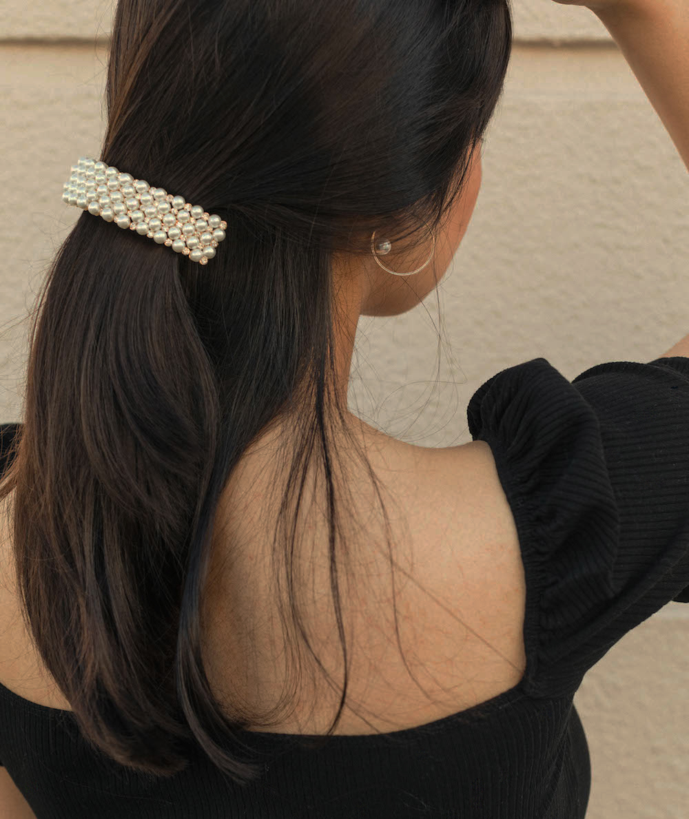 This pearl barrette is a happy pairing of two spring trends — pearls and hair clips. Try it clipped in the back, or on the side, a la Margot Tenenbaum.
