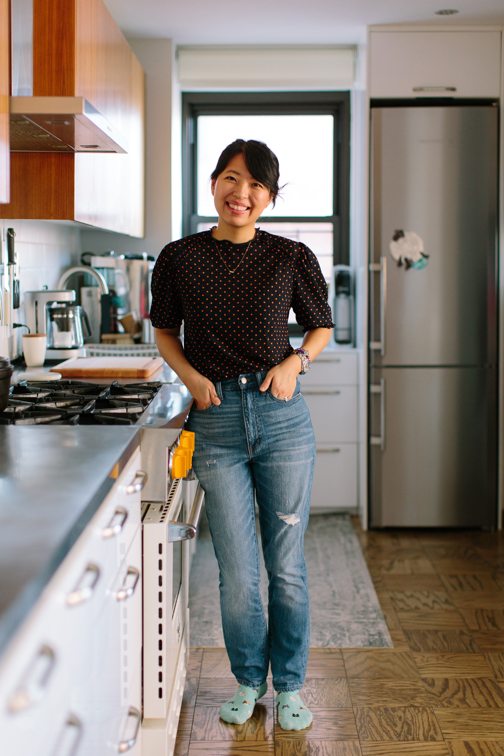 Hana Asbrink is the executive editor at Chowhound (formerly at Food52), who lives in New York City with her husband and five-year-old daughter, Lana. “I love a puff sleeve or ruffle,” she says. “Most of my clothes are pretty straightforward, so a detail helps make them feel playful.” Here, she shares five looks she wore in a week, plus her favorite Korean bbq spot…