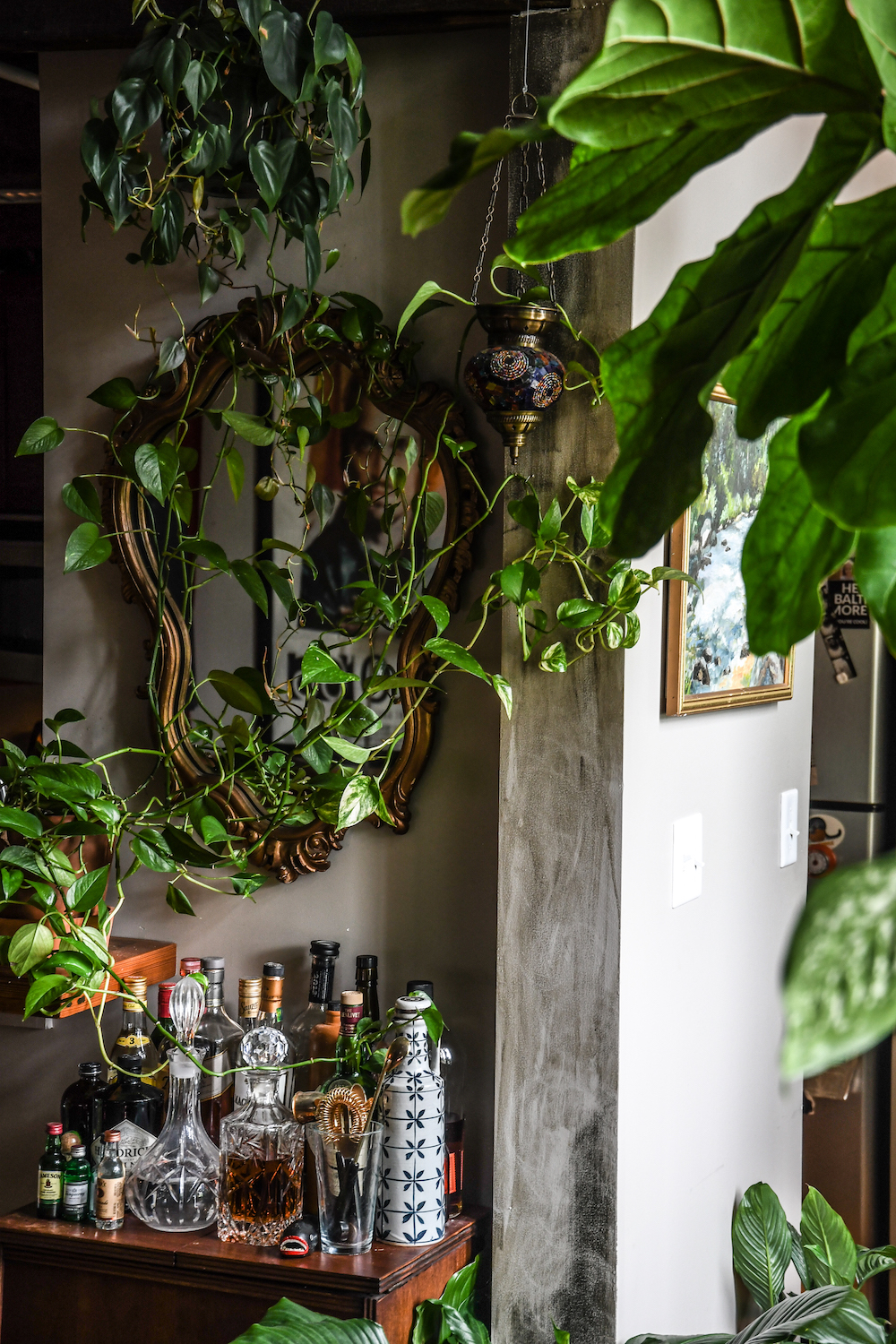 On compromise: All that said, there was a bar cart that Fiona insisted we keep. It opens like a pop-up book and takes up so much space. But it was mandatory for her, so we figured it out. We found a nice corner for it, right under a plant, so now it looks like this cool little jungle bar.