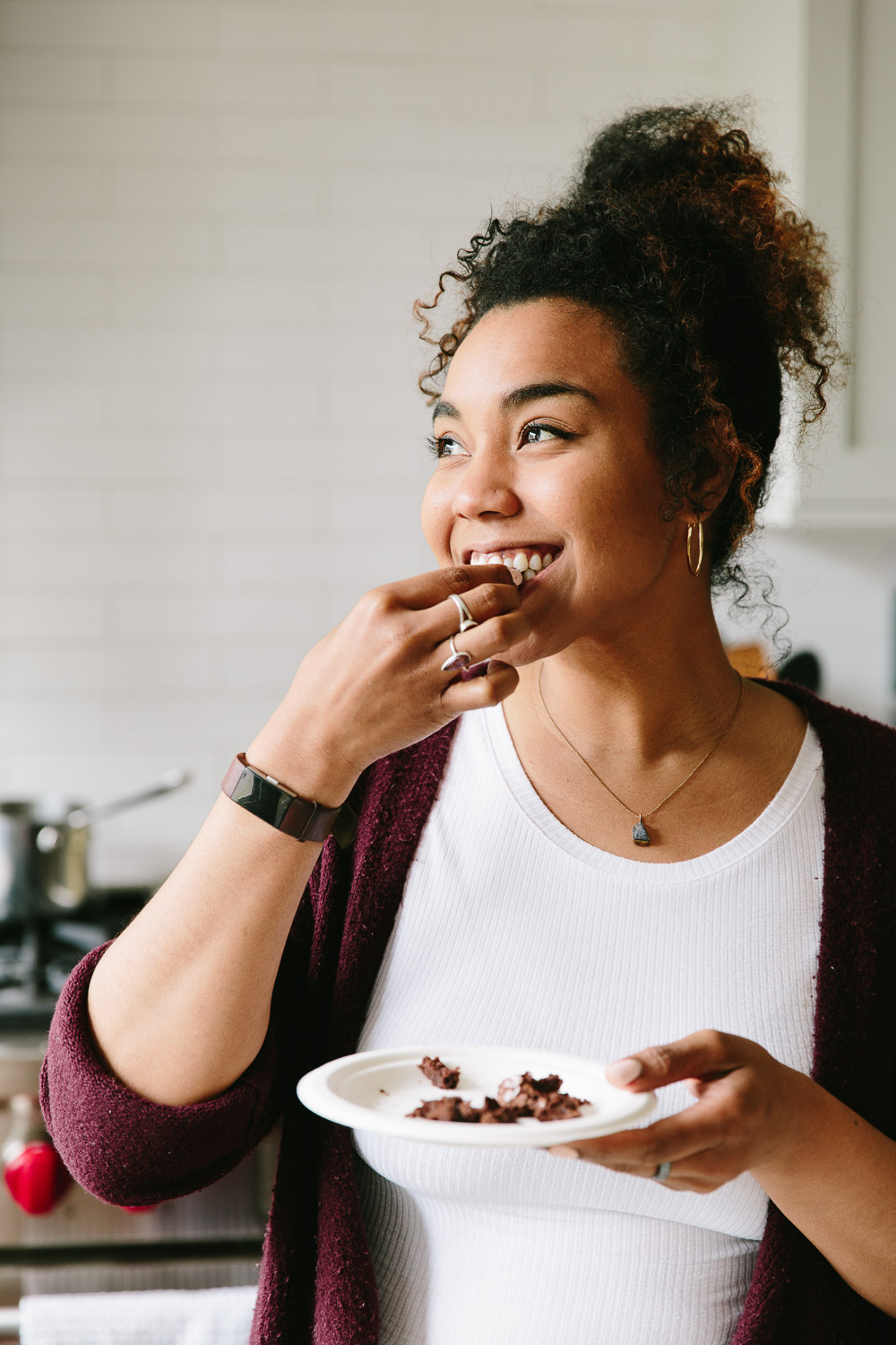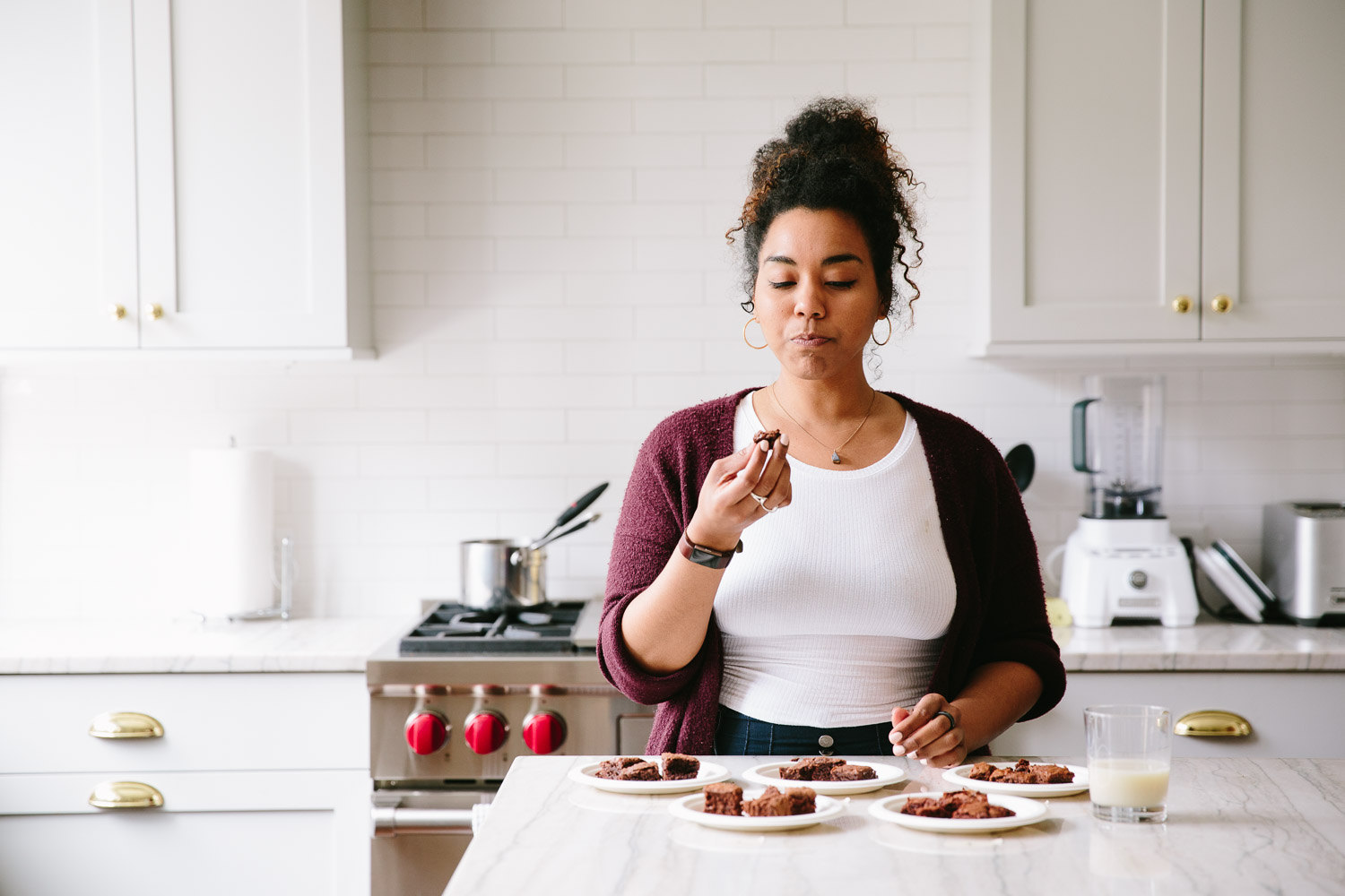 Like all of our taste tests, this one was blind — Jerelle didn’t know which brand she was trying. Between each bite, she cleansed her palate with a few sips of oat milk.