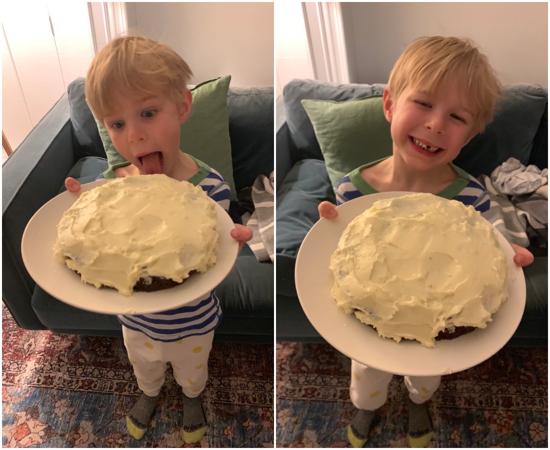 The other big bonus of baking is that kids are often up for helping out. Who will dare turn down the possibility of cake or cookies or brownies? And running the beater and licking spoons and tasting batter? We’ve had the nicest time cooking off the cuff. (The bottom photo is chocolate cake with cream cheese icing from Simple Cake. Not that beautiful, but very delicious!!!!)