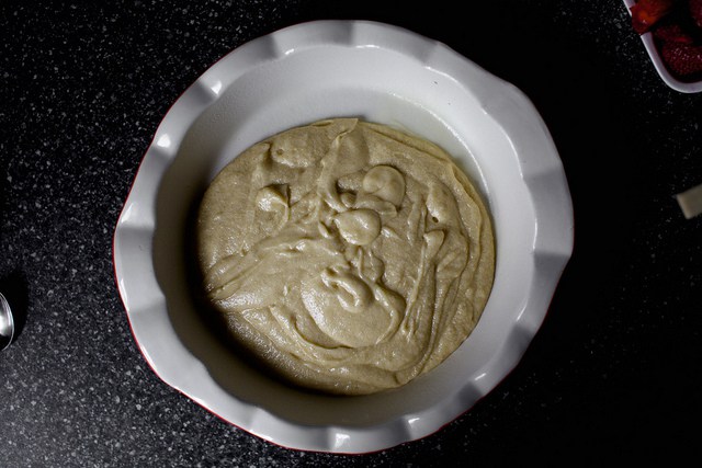 Pour into prepared pie plate. Arrange strawberries, cut side down, on top of batter, as closely as possible in a single layer (though I had to overlap a few to get them all in). Sprinkle remaining 2 tablespoons sugar over berries.