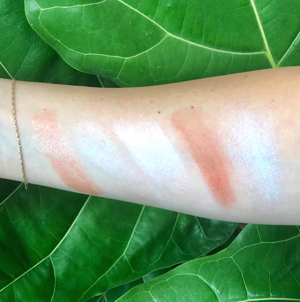Because highlighters are a subtle bunch, here is a photo that looks like a severed arm in a salad, so you can easily see the difference. (Pictured, from left to right: NARS, W3LL PEOPLE, Glossier, Juice Beauty, RMS.)